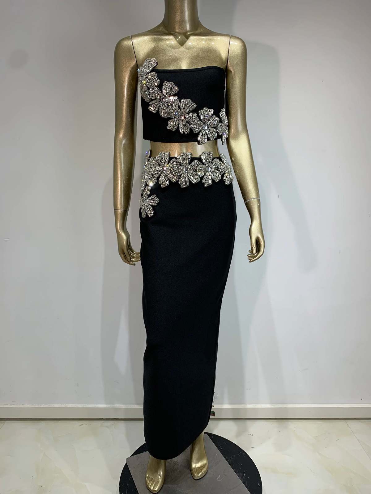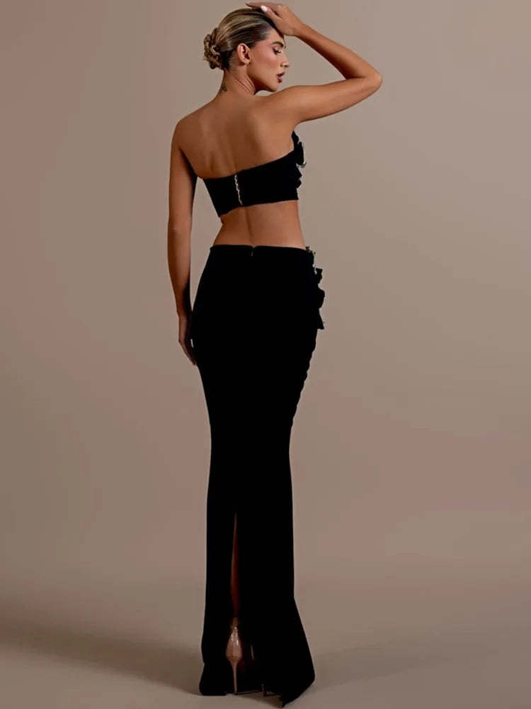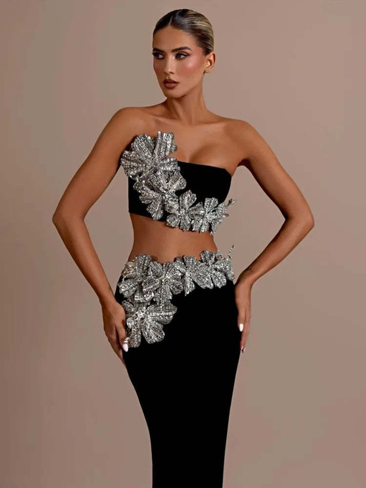 - Sexy Strapless Flower Diamonds Crystal Black Maxi Long Bandage Skirt Set
