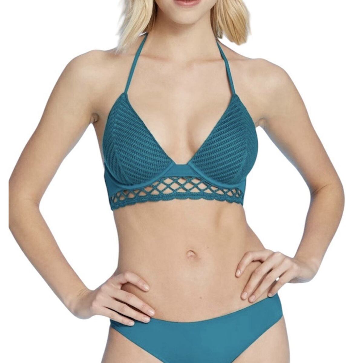 Shade Shore Crochet Triangle Bikini Top 36DD Ocean Blue Teal Long Lined Boho NWT