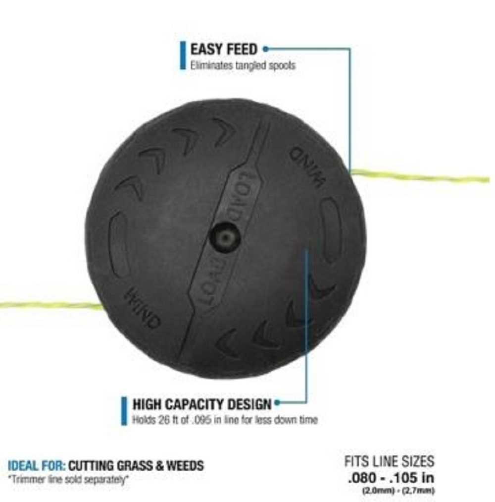 High-quality materials and a rugged construction make this string trimmer head highly durable for use trimming, edging, and performing a variety of grass and weed eating tasks Auto winding technology offers the continuous cutting benefit of a bump head without having to open the head or deal with tangling spool To refill line, simply align the head cover and body and slide line through the head and crank the bump knob to load without the hassle of taking the head apart Holds up to 26 ft. of trimmer line with diameters of .080 in. to .105 in. so you to use the right string trimmer line for the job The versatile max load bump feed head is compatible with nearly all brands of gas string trimmers like Echo, Stihl, Husqvarna, Redmax, Ryobi, Black Decker, Cub Cadet, Weed Eater, Poulan, MTD, and more This no-spool bump feed head delivers exceptional performance that can withstand the extreme demand of any job