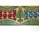 The Shiny Brite Glass Tree Ornaments are a set of 24 round glass ornaments from the 1950s, featuring a mid-century modern style. Each ornament measures 1 inch in height and width, and have some wear from age. Made in the United States, these small ornaments come in 2 boxes and have a solid pattern. Perfect for Christmas decor, these vintage ornaments are an original production from the Shiny Brite franchise.