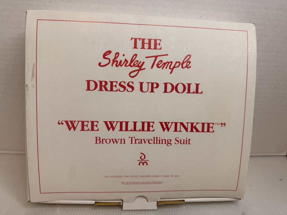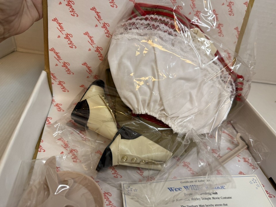 This is a Danbury Mint Shirley Temple Dress Up Doll Outfit called "Wee Willie Winkie" that comes in a box. The outfit includes a dress, shoes, and stand, and is made of cloth. The doll is a baby doll and is gendered as a girl doll. The outfit is a special occasion type and is multicolored. The doll is vintage and was manufactured in the 1990s. The product line is Shirley Temple Dress Up Doll.