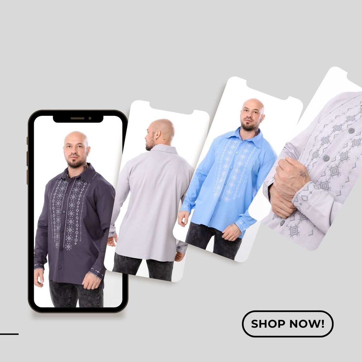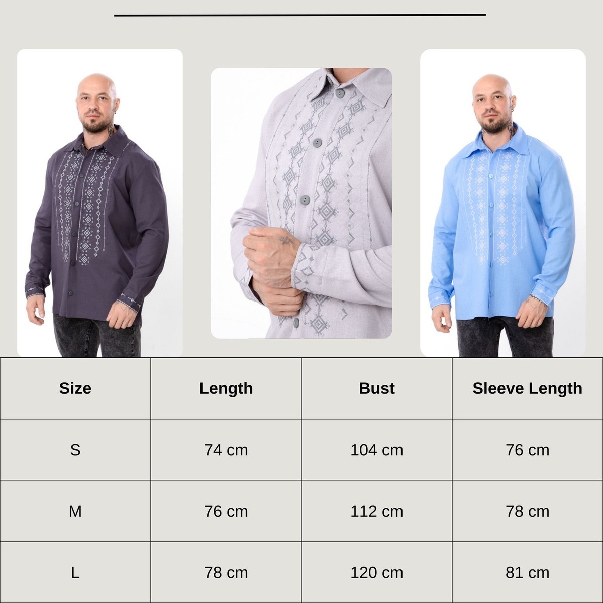 Men?s long-sleeve shirt made from a linen-viscose blend with an ornament ? a stylish and practical choice for everyday wear. Natural linen provides coolness and freshness in warm weather, while viscose makes the fabric soft, flexible, and resistant to wrinkling. The ornament adds individuality, making the shirt a standout piece. The straight cut and long sleeves ensure versatility and comfort, while the option to roll up sleeves creates a relaxed style. Perfect for work, walks, or meetings, combining elegance and practicality in everyday outfits.