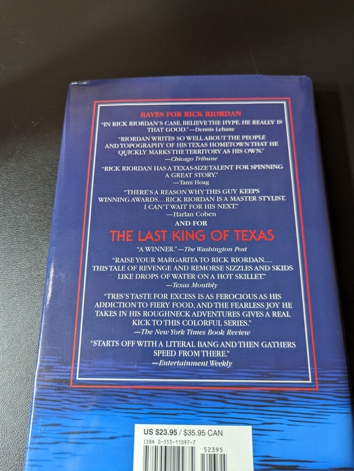 This is a signed first edition hardcover book titled "The Devil Went Down to Austin" written by Rick Riordan. The book was published by Bantam in 2001 and has a total of 336 pages. It is a fiction book with the genre of general and mystery/detective.