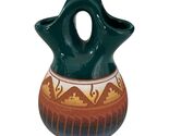 A beautiful hand-painted **Native American wedding vase** by **E. Etsitty (Dine/Navajo)**, dated **2008**. This traditional double-spout vessel features a deep forest green glaze with a terracotta base and geometric Southwest patterns in gold, red, and brown tones. The piece is **artist-signed on the bottom** and showcases fine Navajo craftsmanship, perfect for collectors of Indigenous pottery and desert-inspired decor.