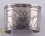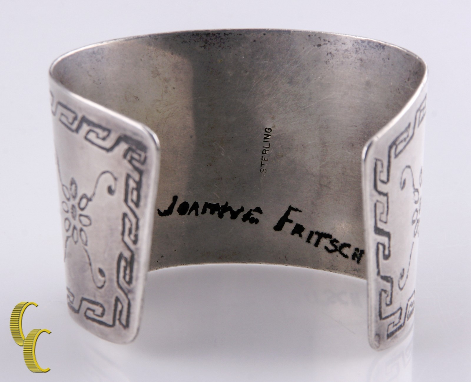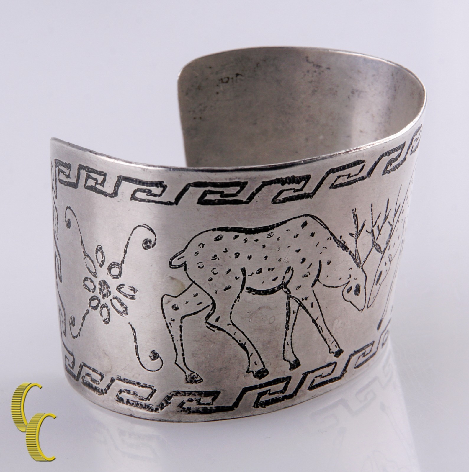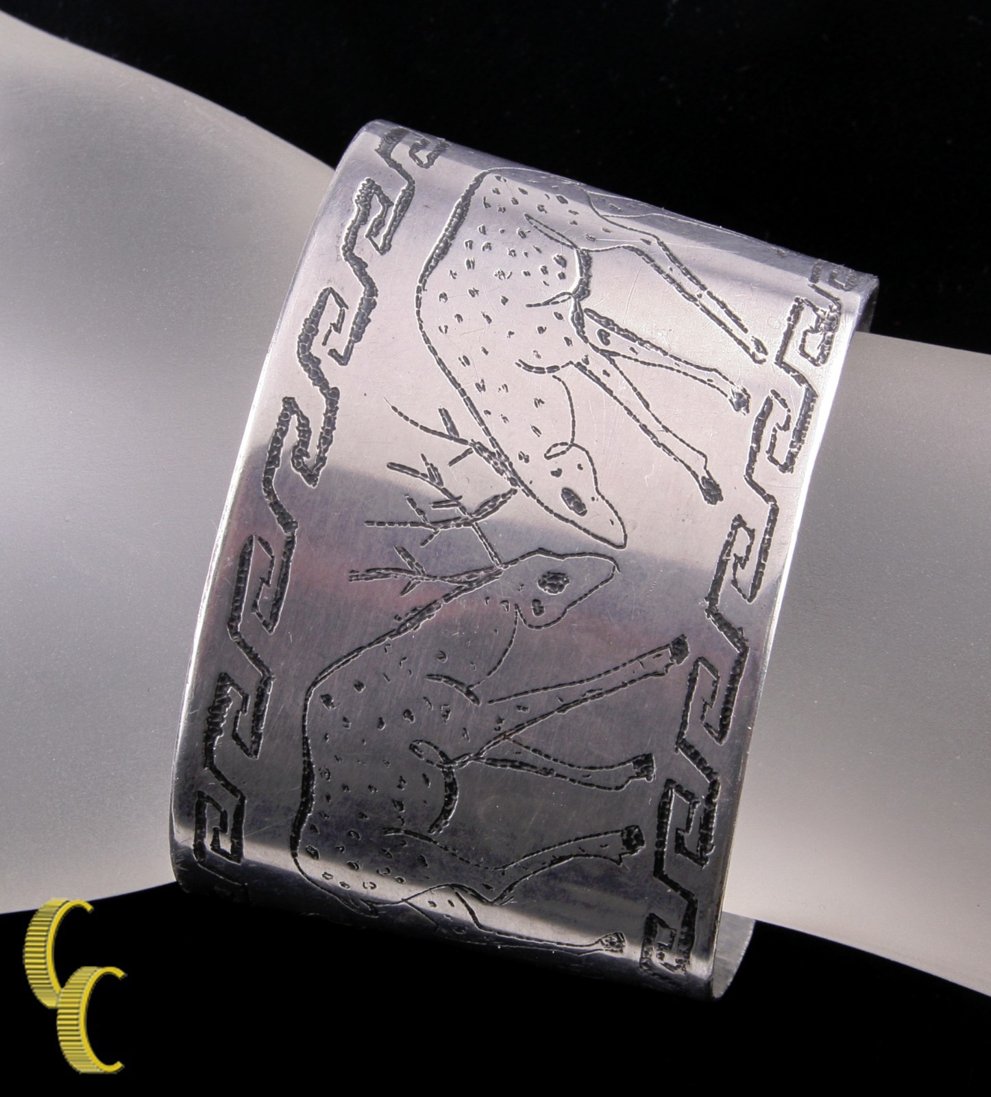 Signed Joanne Fritsch Sterling Silver Cuff Bracelet With Etched Antelope Deer