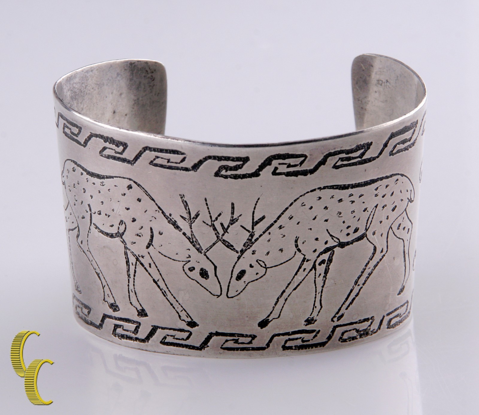 - Signed Joanne Fritsch Sterling Silver Cuff Bracelet With Etched Antelope Deer