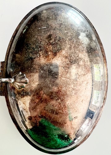 Green tint is a reflection, not actual color of metal. Approx 9.5 x 7.5"