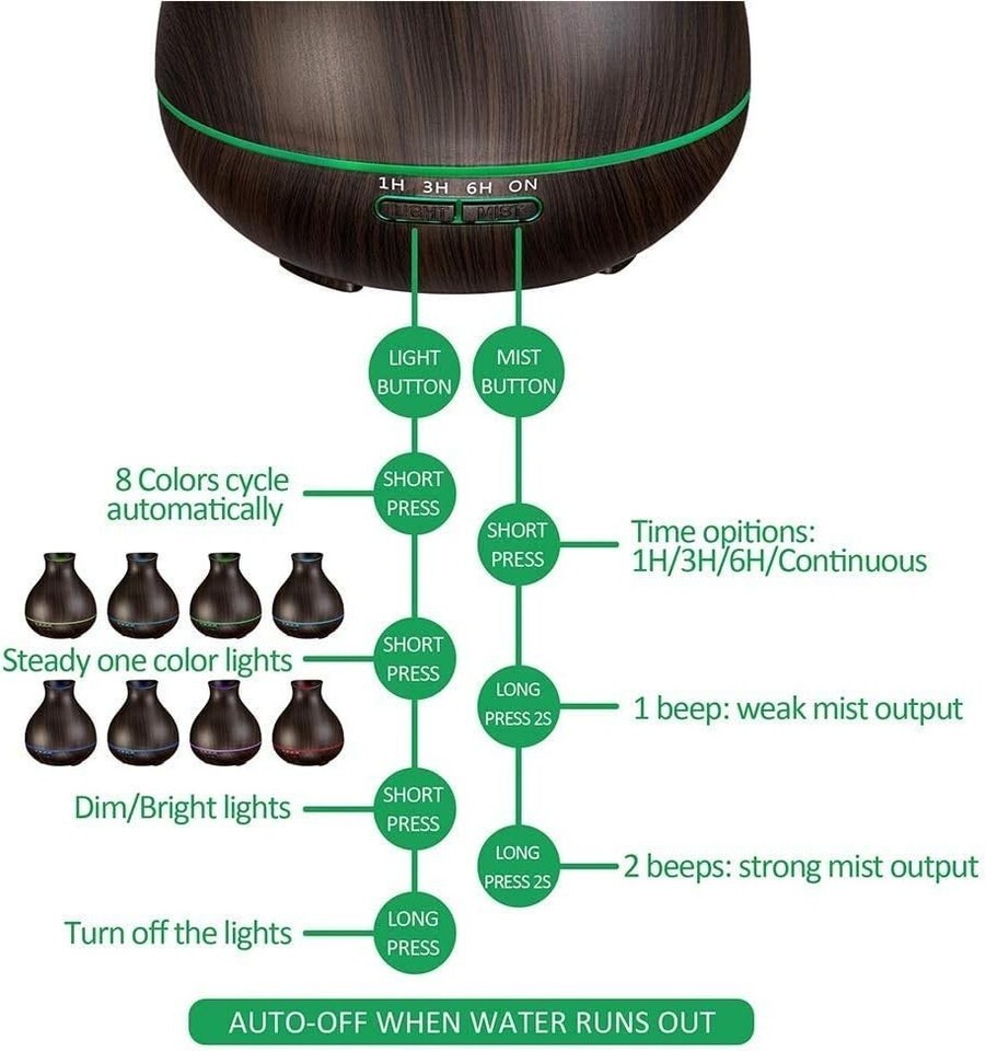 Features: Time Release,Timer Setting,Waterless Auto-Off,Multiple Light Setting,Silent Operation,Long Lasting Aroma