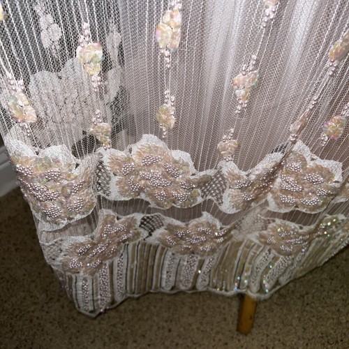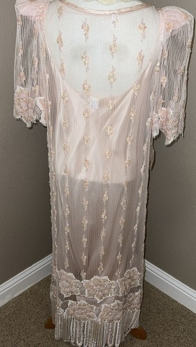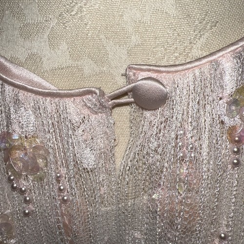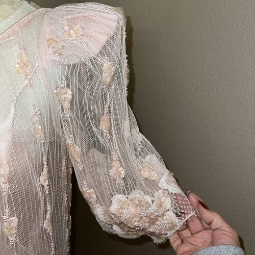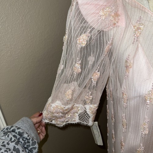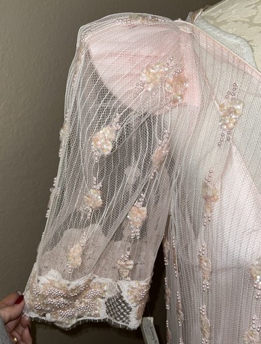 This pink gown is made from luxurious silk material and comes with tags attached. Its attractive accents of beaded pearls make it a perfect addition to your wardrobe. Make a statement with this gorgeous gown that is perfect for any occasion.