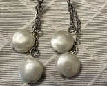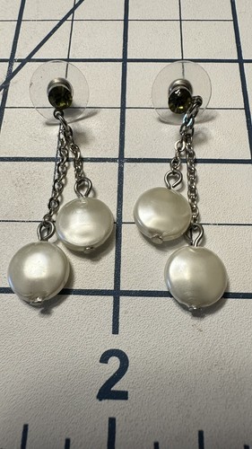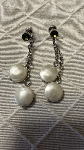- Silver Color Post Dangle Drop Earrings White Faux Pearl Green Glass Stones