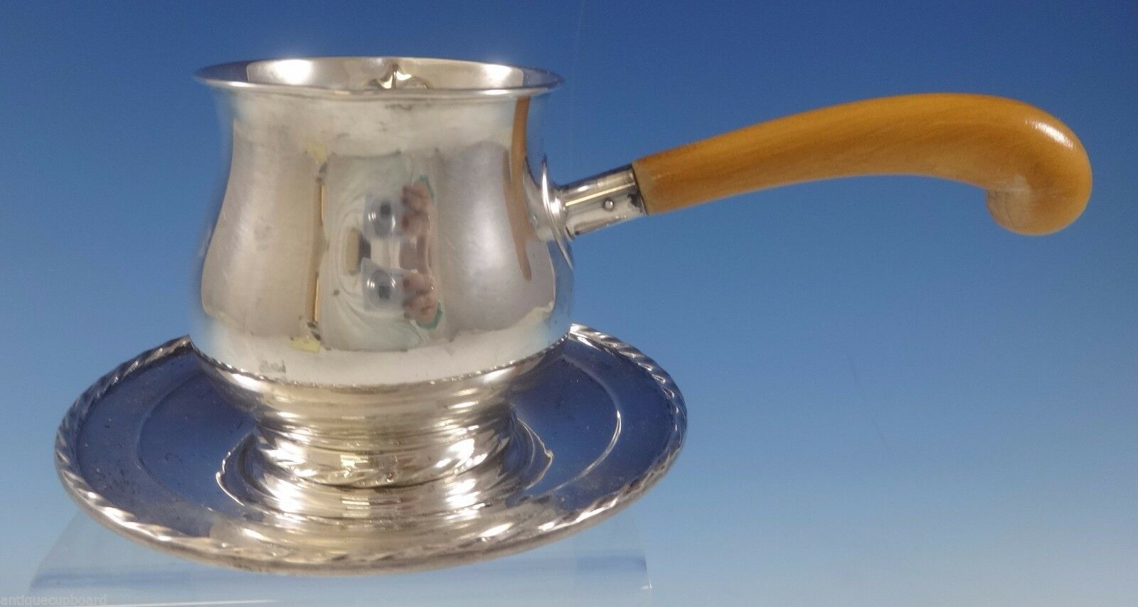 Rare Silver Flutes by Towle sterling silver pipkin/sauce boat and underplate. The pipkin has a wood handle and it's marked with #172. It measures 3 1/4" tall, 7 1/2" wide (with handle), and it weighs 2.98 ozt. The underplate is 1/2" tall, 4 1/2" in diameter, and it weighs 1.57 ozt. The pieces are not monogrammed and are in excellent condition.