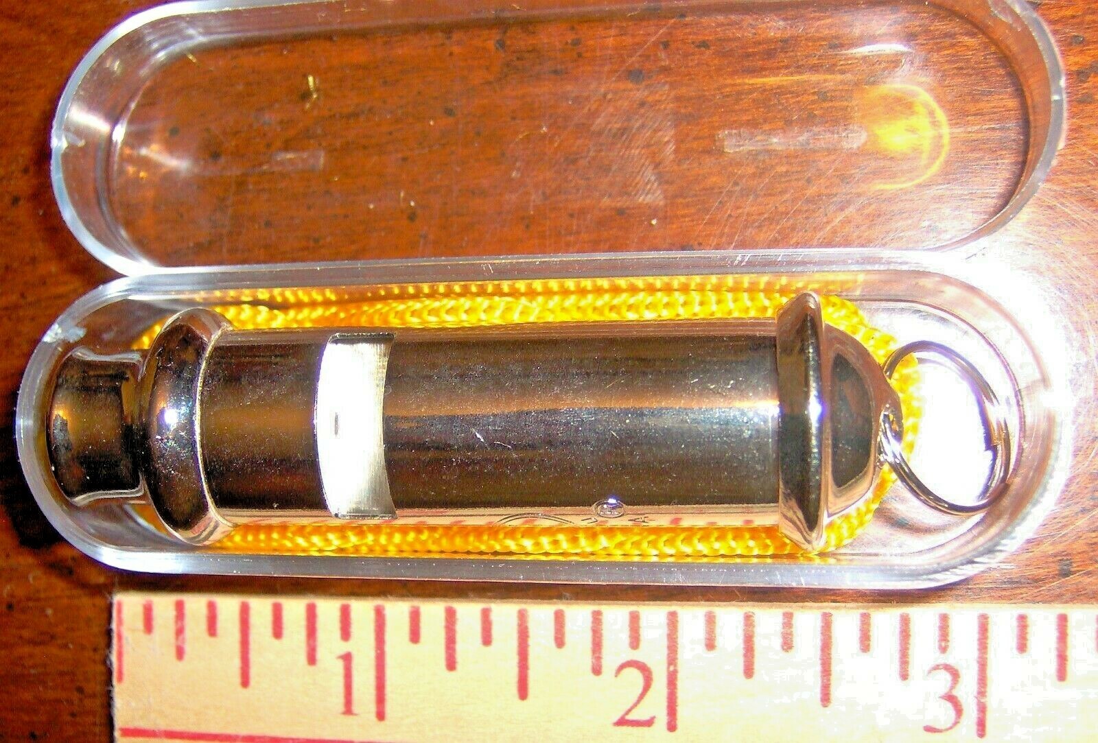 FOR SALE IS ONE (1) NEW LONDON POLICE WHISTLE WITH SILVER FINISH AND ORANGE color NYLON LANYARD BY HUTOU BRAND MPN 34584 UPC# 792363954631. GET NOTICED WITH THIS SILVER COLOR CHROME PLATE FINISH, LONDON STYLE POLICE WHISTLE WITH BRIGHT ORANGE NYLON NECK LANYARD. FEATURES STYLISH DESIGN AND DISTINCTIVE TWO TONE SHRILL. THIS LONDON POLICE WHISTLE CALLS TO MIND THE WHISTLES CARRIED BY POLICE IN GREAT BRITAIN AND THROUGHOUT EUROPE. ALSO KNOWN AS A BOBBY WHISTLE OR METROPOLITAN POLICE WHISTLE WITH A 2 1/2" length. SMALL AND COMPACT DESIGN IS GREAT FOR CAMPING, HIKING, MOUNTAIN CLIMBING, OUTDOOR SPORTS, EMERGENCY DISTRESS, SOS CALL, ETC. WITH THE TWO TONES, THE DISTINCTIVE TWO TONE SOUND IS MORE LIKELY TO TRAVEL. PACK THIS IN YOUR EMERGENCY KIT, TAKE ONE WITH YOU WHEN HIKING OR CAMPING, KEEP ONE IN THE CAR OR TRUCK FOR AN EMERGENCY. YOU WILL RECEIVE ONE (1) LONDON POLICE WHISTLE WITH ORANGE NYLON LANYARD SHIPPED BY USPS.....