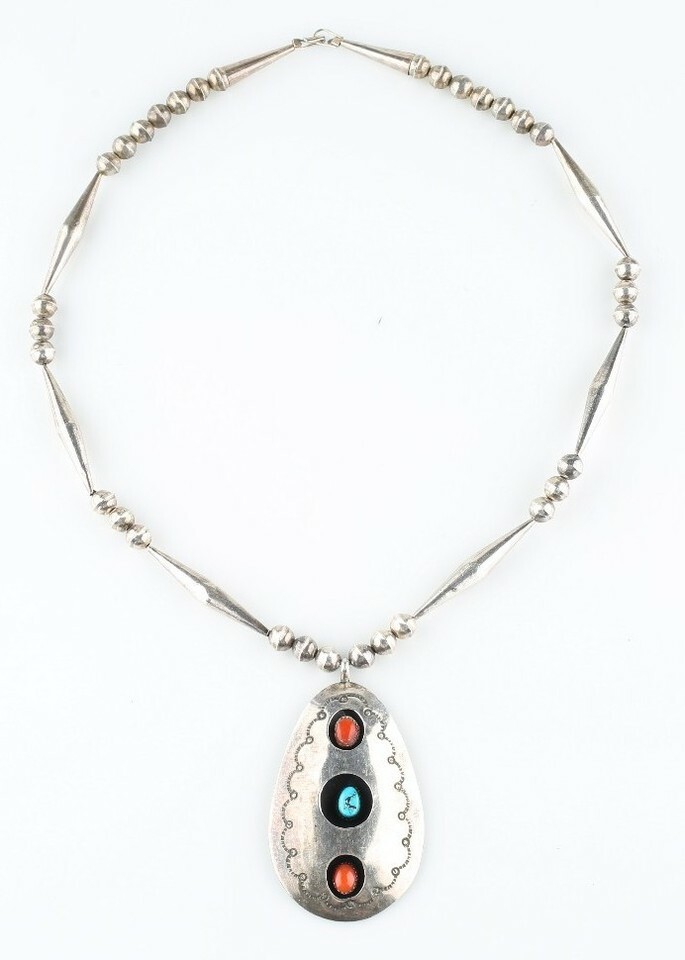 - Silver Navajo Shadow Box Pendant w/ Turquoise and Coral Cabochons & silver Beads