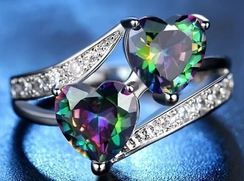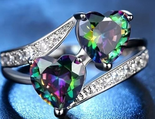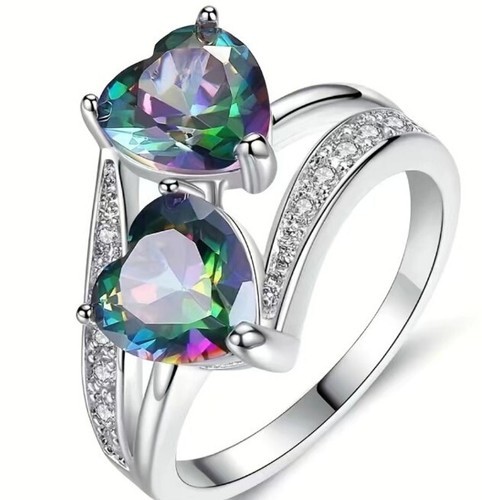 Two (2) heart-shaped crystals are centered at the top of the ring