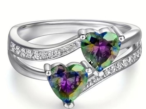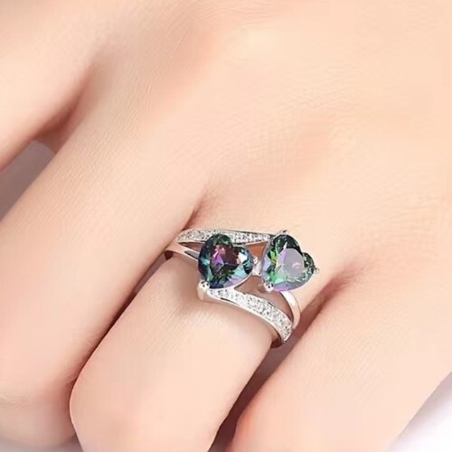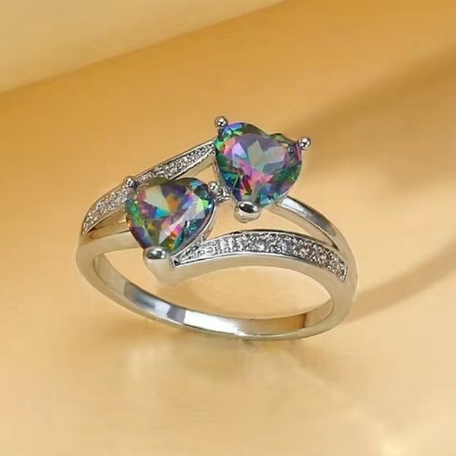Two (2) heart-shaped crystals are centered at the top of the ring