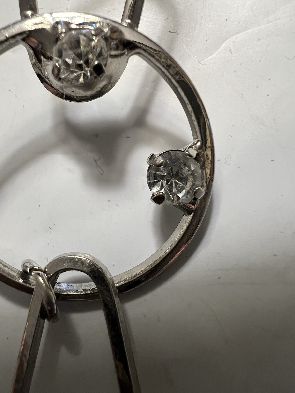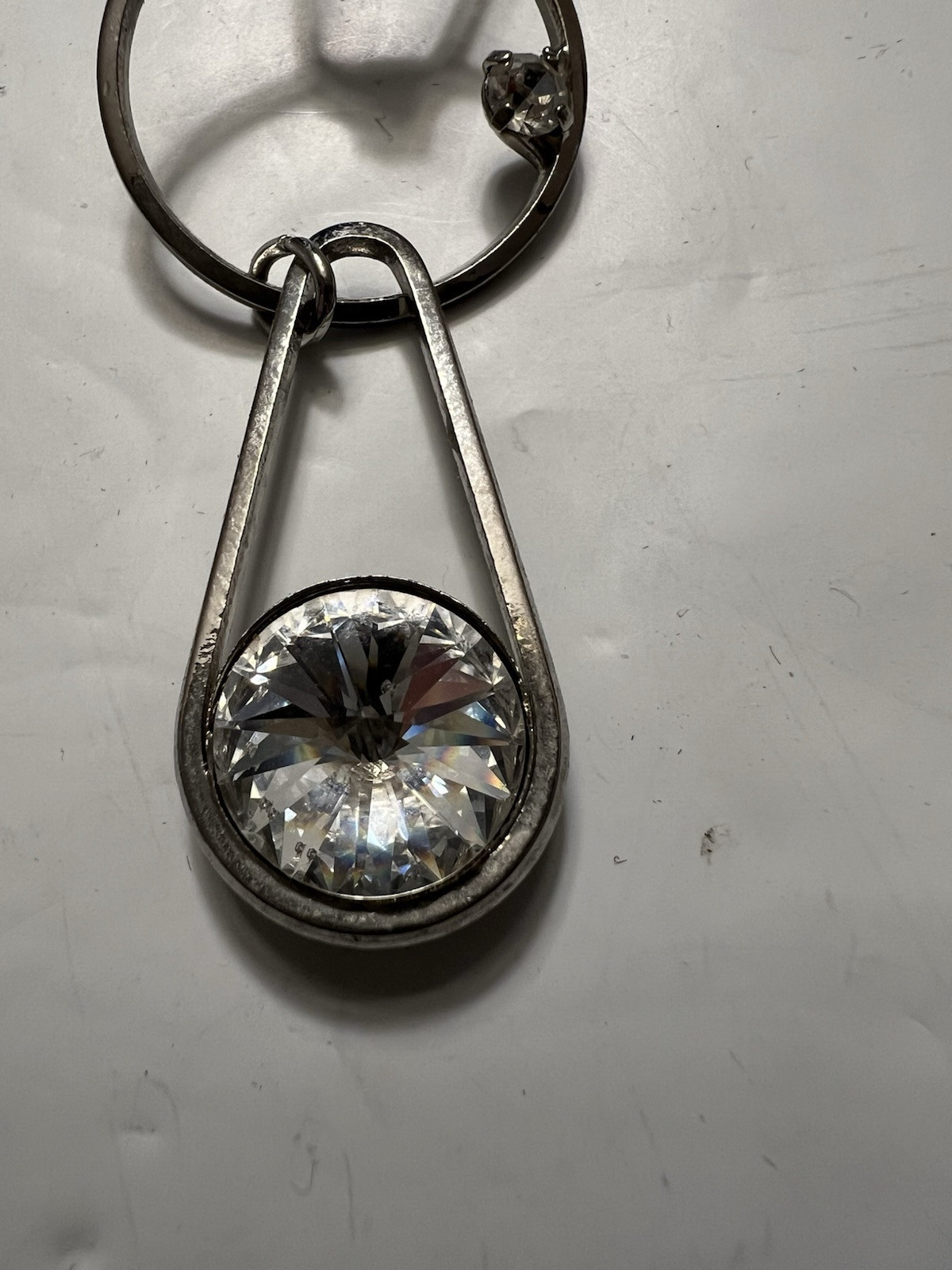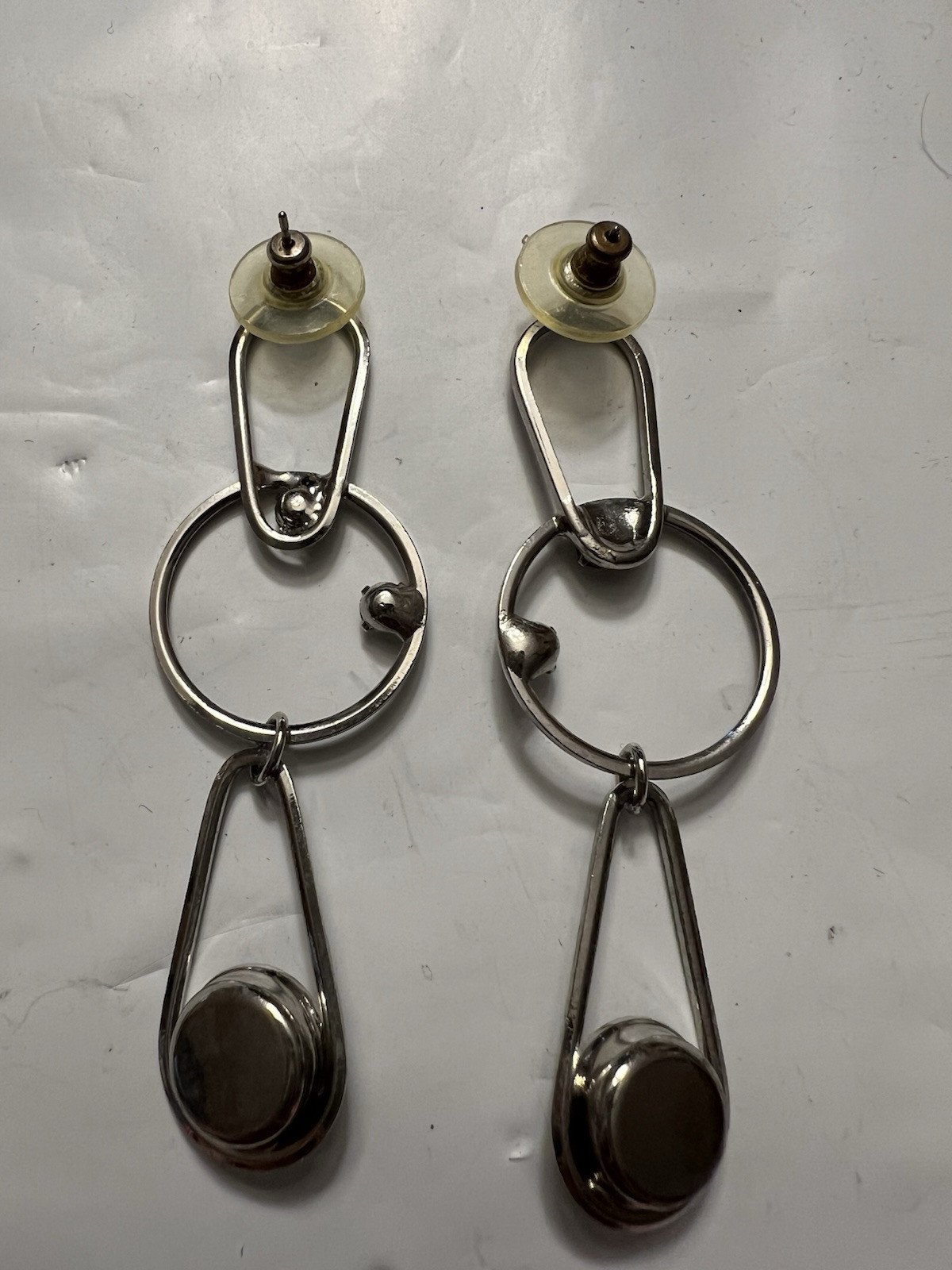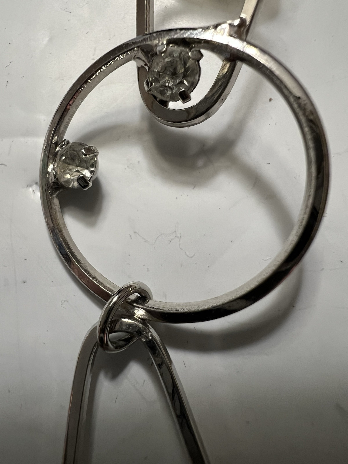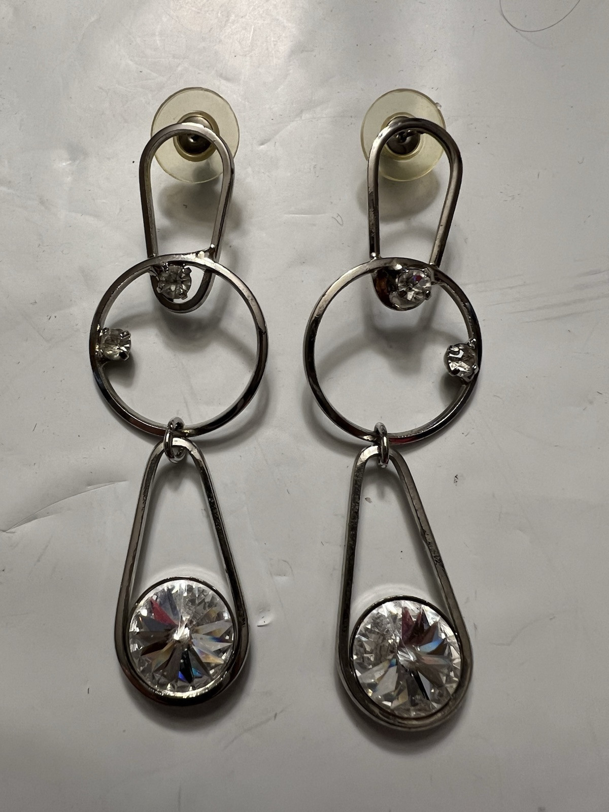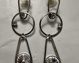These statement earrings feature a bold design with a silver tone and clear stone construction. The earrings are of drop/dangle style and are adorned with clear iridescent beads, adding a touch of beauty and elegance to any outfit. The silver tone metal complements the clear stones, creating a striking and fashionable accessory for various occasions.