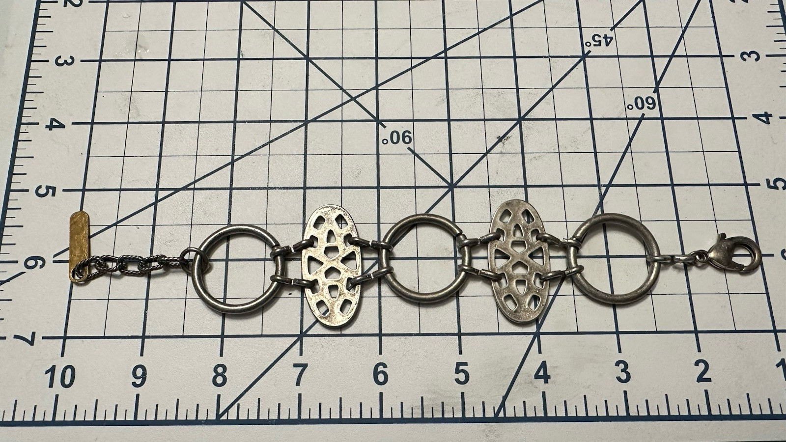 This is a Perch brand silver tone bracelet with a lobster closure. It is signed and has a length of 7.5-8 inches. The bracelet has a chain style and is designed with beauty, art, bohemian, and fashion in mind.