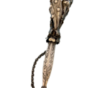 Outstanding silver tussie mussie with cast four sided cup featuring two birds, lily of the valley flowers, and fuchsia flowers. It is unmarked, probably silverplate. It has three tripod legs engraved with leaves and flowers and a screw on cap with chain. It measures 5 1/2" long and dates from the 1890s. Remarkable!