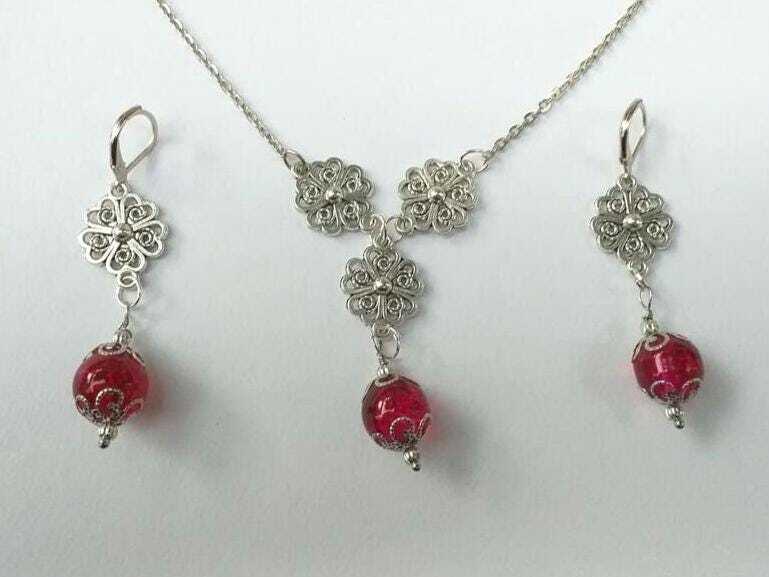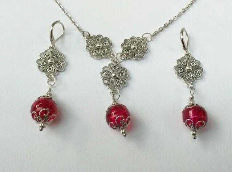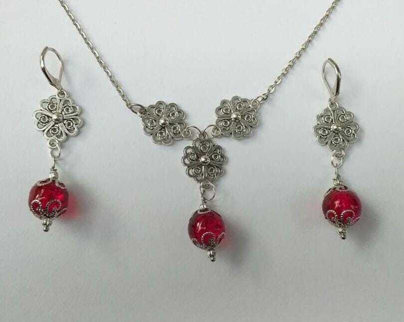 Beautiful Set of silver-tone Antique style filigree flower shaped little pendants and Ruby red crackle glass beads necklace and earrings. Silver tone pendant Victorian style necklace and earrings. Boho necklace. Bohemian necklace and earrings. Romantic style necklace and earrings. Royal style jewelry set. Baroque style jewelry set. Antique style jewelry set.