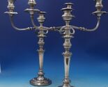 Wonderful silver on copper three-light candelabra pair (maker unknown). The candelabras measure 20" tall x 17" (arm span) x 6" (base). They are not monogrammed and are in AS-IS condition as shown in the photos. One has copper showing through, and a slight crack, some dings / dents on pieces. Superb!