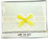 Cream handmade paper embellished with cut out heart and yellow bow.
