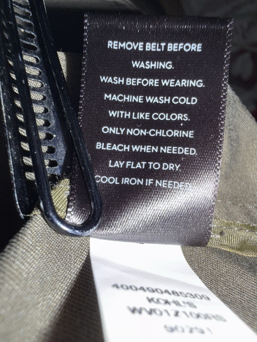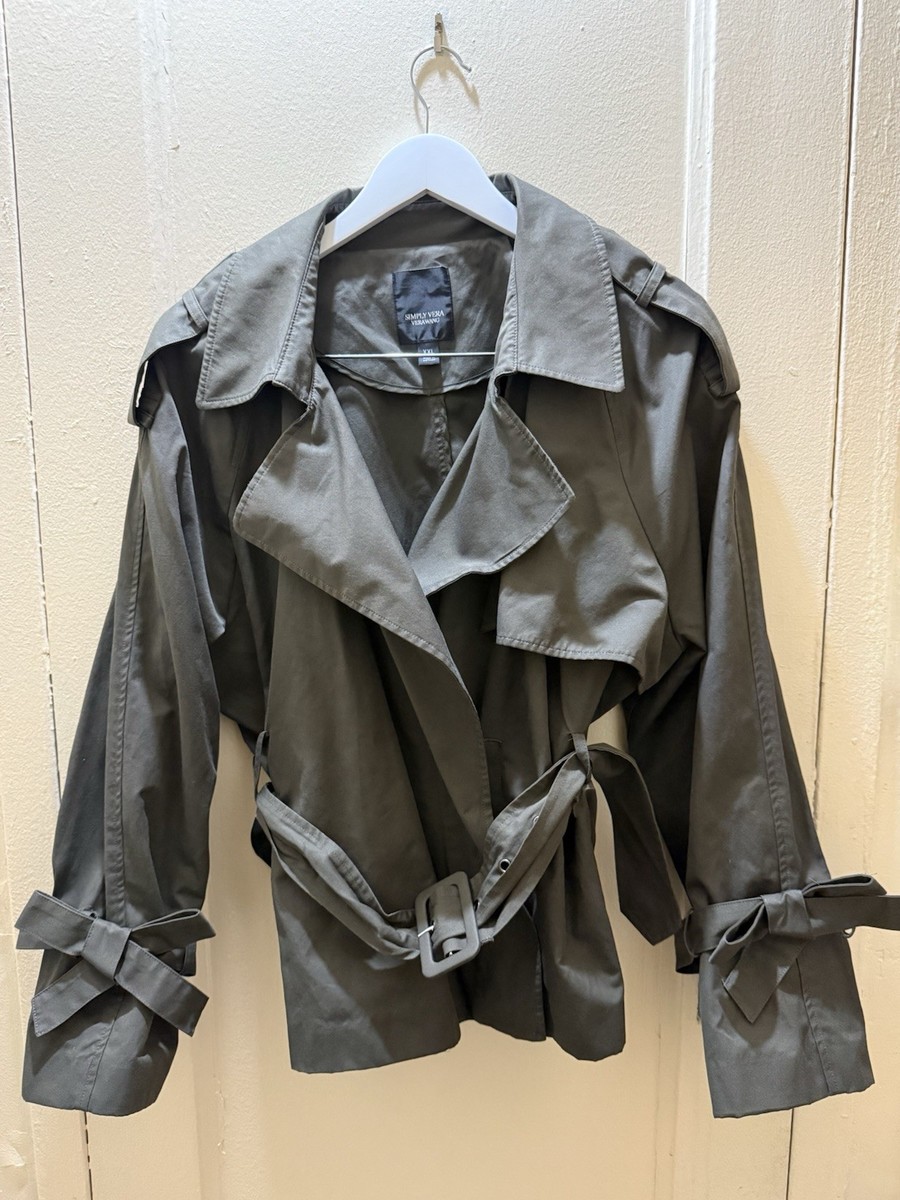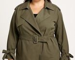 Chic Simply Vera Vera Wang olive trench jacket with a modern cropped fit and belted waist. Features wide lapels, bow-tie cuffs, and shoulder epaulettes for a polished, city-ready look. Perfect lightweight layer to dress up jeans, workwear, or a night-out outfit.