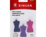 SINGER Hook Eye Needle Threader Set. Set of 3 needle threaders in fun dress form shape and assorted color. Needle threader for use with hand and machine needles. Compatible with all needle eye sizes. Instructions: Insert hook into eye of needle. Hang thread onto hook. Pull needle off hook. Threading is completed. CHK-00148DS