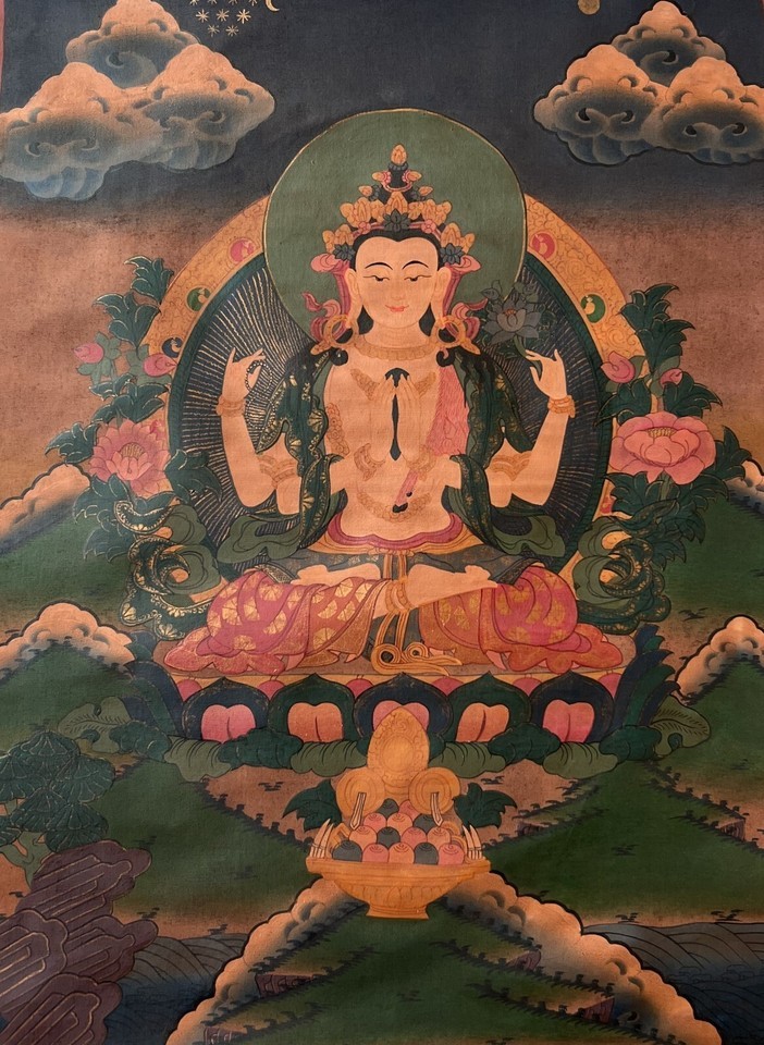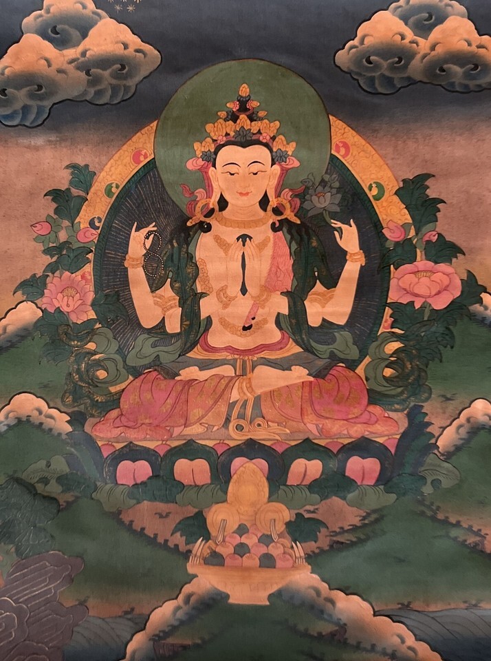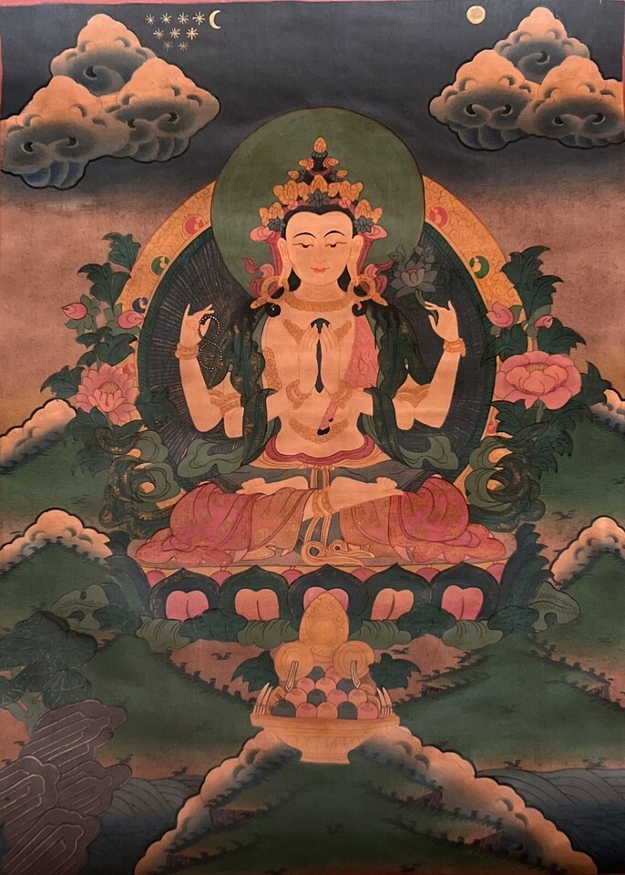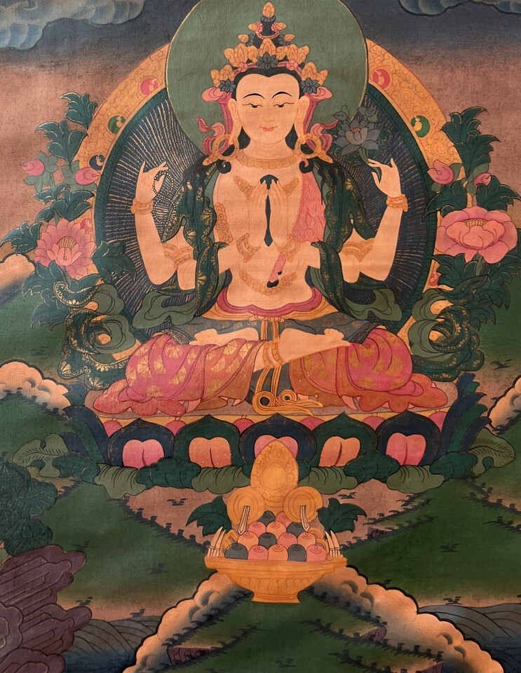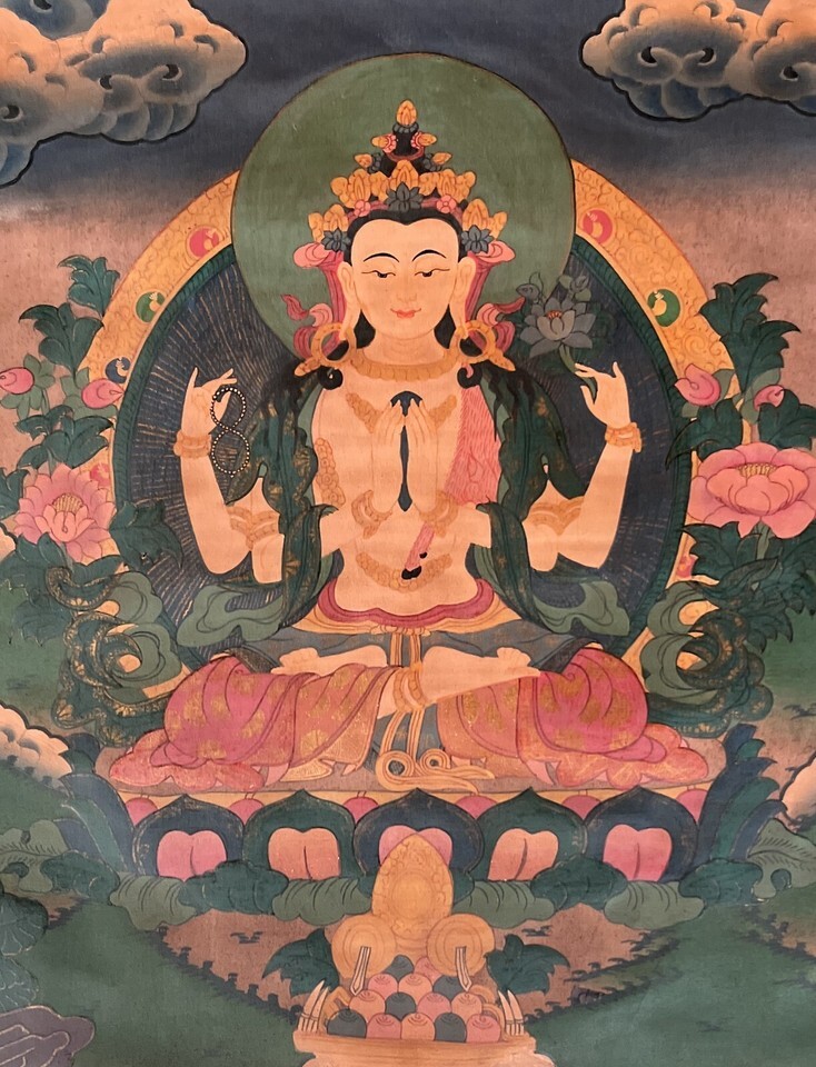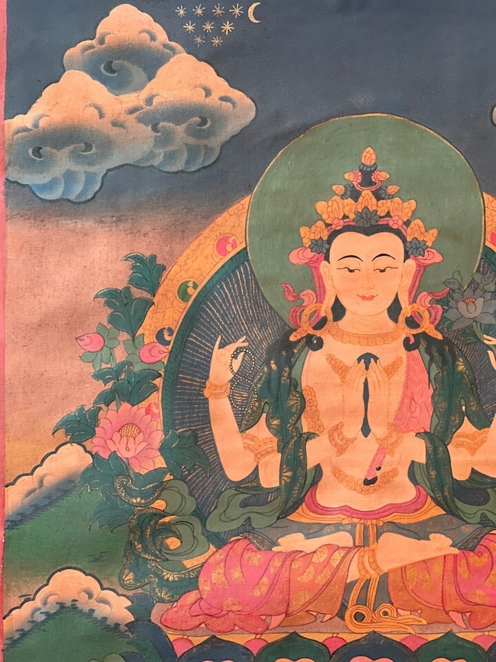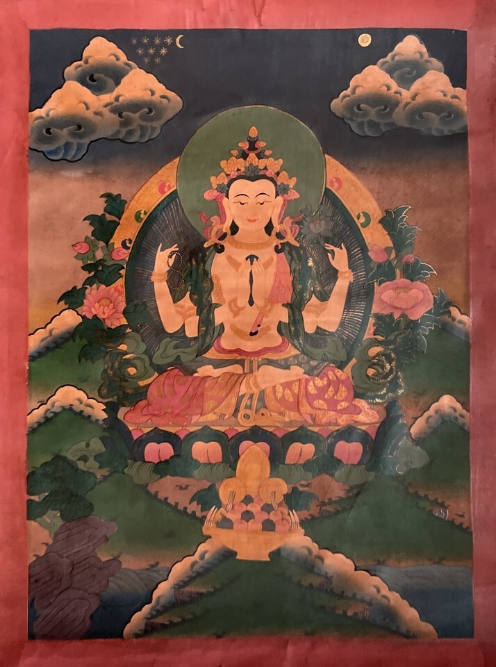 SIX ARMED AVALOKITESHVARA CHENREZIG OLD OIL-VARNISHED TIBETAN THANGKA PAINTING