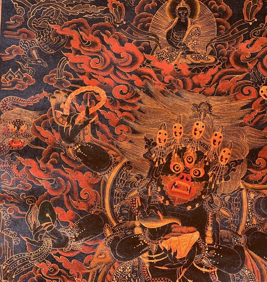 Mahakala's six arms symbolize his mastery of the six perfections of a Bodhisattva, and his two feet represent wisdom and method. He holds a rosary of human skulls in his upper right hand, which he uses to benefit sentient beings. In his lower right hand, he has a ritual drum or damaru. His upper left-hand holds a trident, indicating his abandonment of the three realms' delusions. He has a lasso in his lower left hand, symbolizing his power to bind demons and evil forces. His two primary hands hold a ritual curved knife and a skull bowl, representing his ability to sever the root of delusion and his realization of emptiness, respectively.