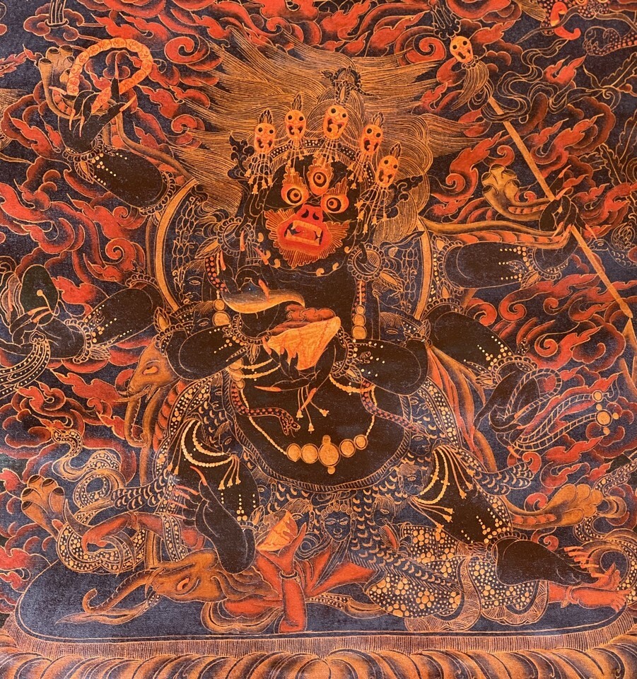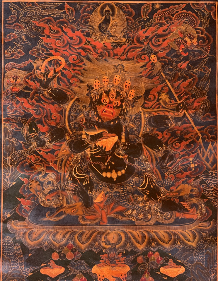 SIX ARMED MAHAKALA PROTECTOR ORIGINAL TIBETAN THANGKA PAINTING- OIL VARNISHED