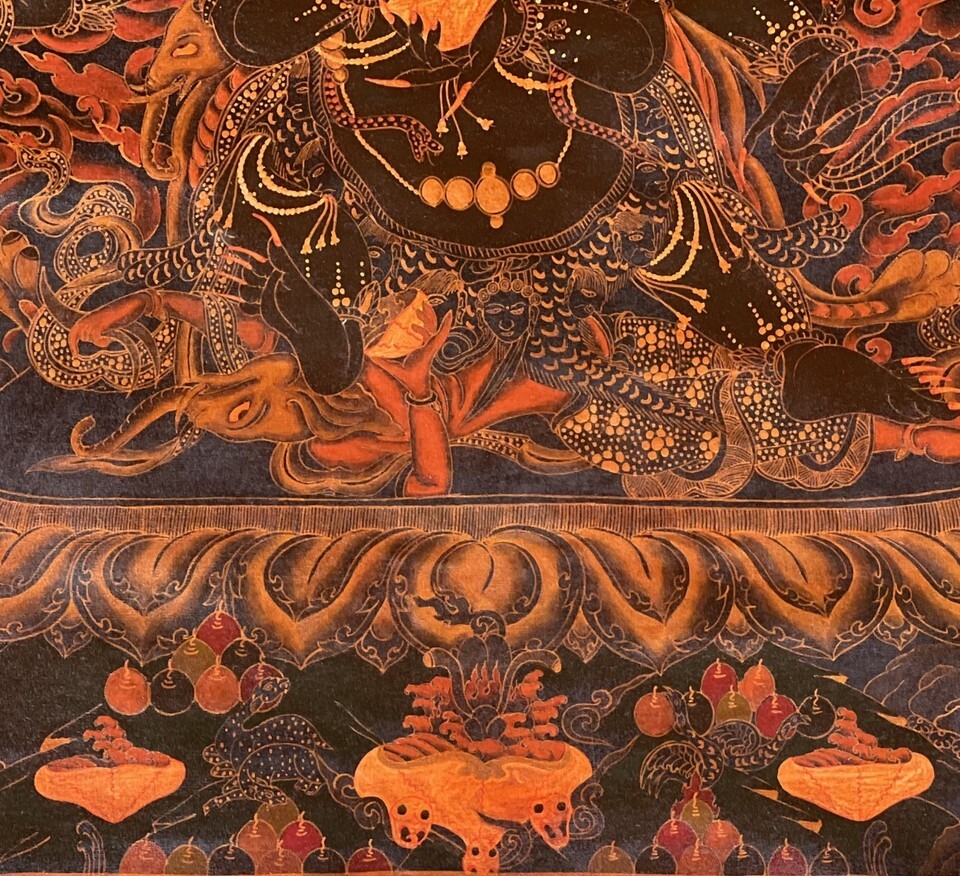 Mahakala is often depicted in different forms, including the Black aspect with a crown of five skulls, representing the transformation of the five poisons into wisdom. He stands on the corpse of the elephant-headed god Ganesh, signifying his ability to overcome obstacles. His black color represents his role in destroying evil and obstructions on the spiritual path. He is considered a fierce and wrathful aspect of Avalokiteshvara, the Lord of Compassion.