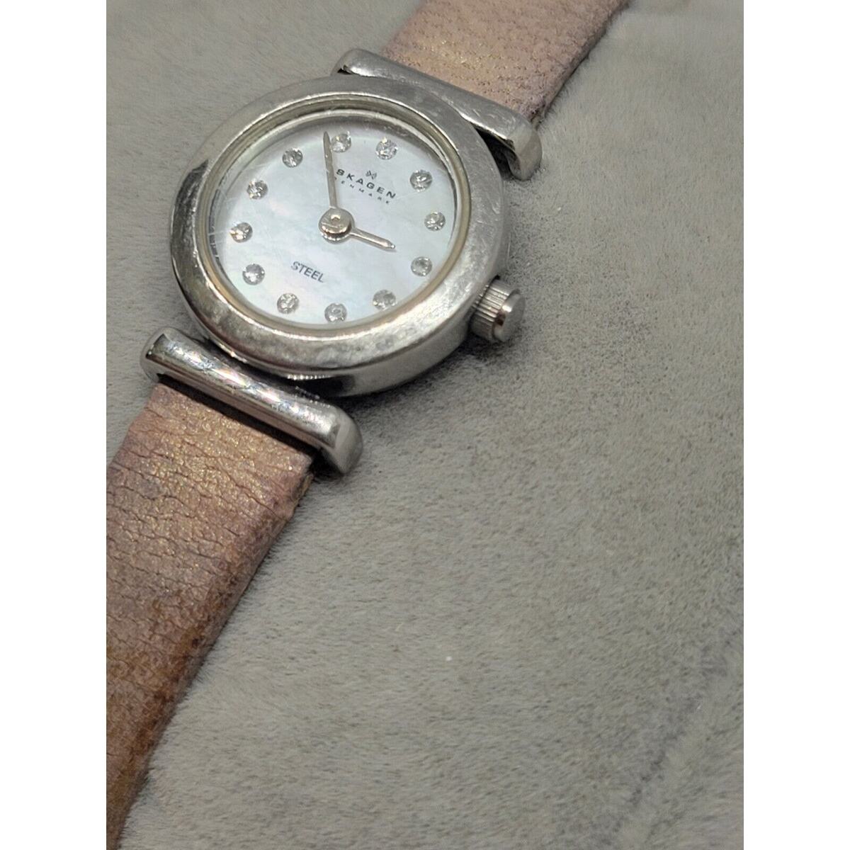 This Skagen Denmark women's watch features a 25mm stainless steel case with a silver bezel and a cream Mother of Pearl dial adorned with diamond markers. The watch has a pink leather two-piece strap and is water-resistant up to 30 meters. It has a classic and casual style, and operates on a new battery. Made in Denmark, this analog wristwatch does not come with papers, original box, or manual.