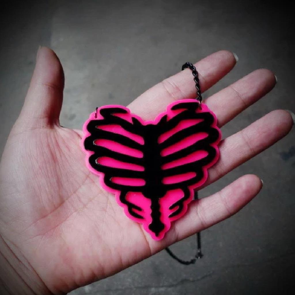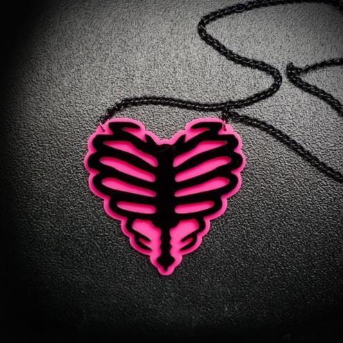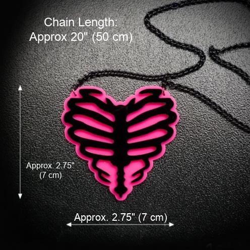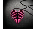 - SKELETON HEART NECKLACE 2.75" Hot Pink Black Acrylic Pendant Ribcage Halloween