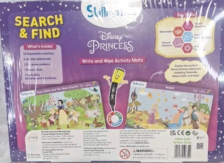 The Skillmatics Preschool Learning Activity is a fun and educational toy designed for kids aged 3-6. With a Disney Princess theme, children can search and find their favorite princesses on the mat. Made by Disney, this activity not only promotes learning and cognitive development but also encourages imaginative play and creativity. Perfect for young children who love Disney Princesses, this toy is a delightful addition to any child's playtime. Made in India, this high-quality educational toy is sure to provide hours of entertainment and learning for little ones.