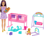 It's double the fun and cuteness with this Barbie twinning nursery playset! Skipper -the teenage sister of Barbie -has two of everything to babysit the twin dolls, both wearing removable diapers. There's a crib for two that really rocks, a rainbow swing with a seat for the twins, a bouncing baby see-saw, and a play arch that can fit on the crib or used on the ground. With additional accessories like bottles, blankets, bibs, toy trains, and teddy bears, Skipper has everything she needs to take care of the adorable twins! Doll cannot stand alone. Colors and decorations may vary.
