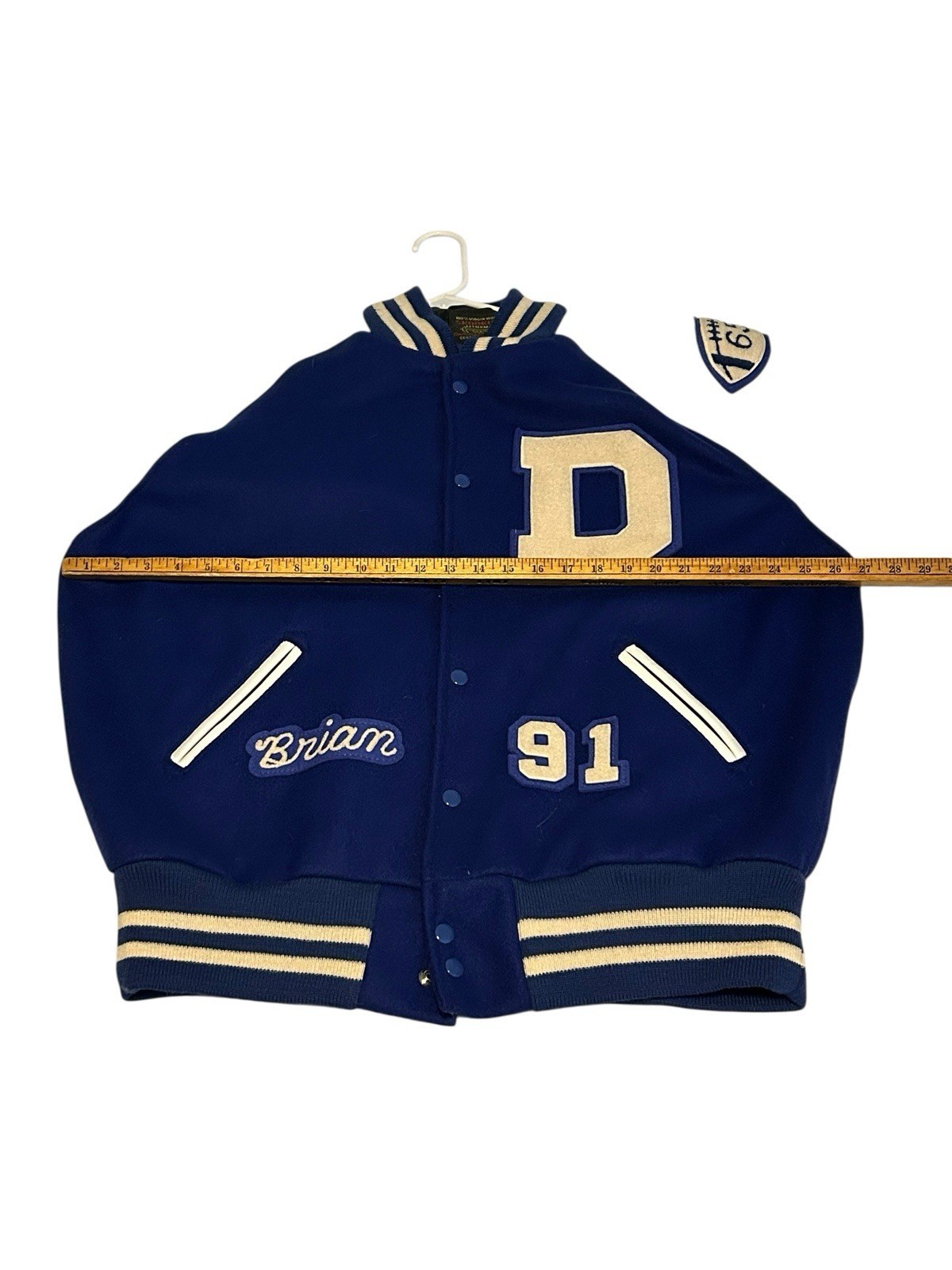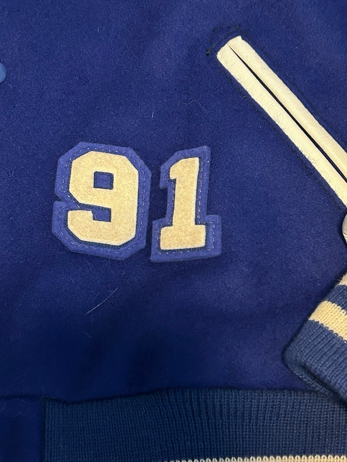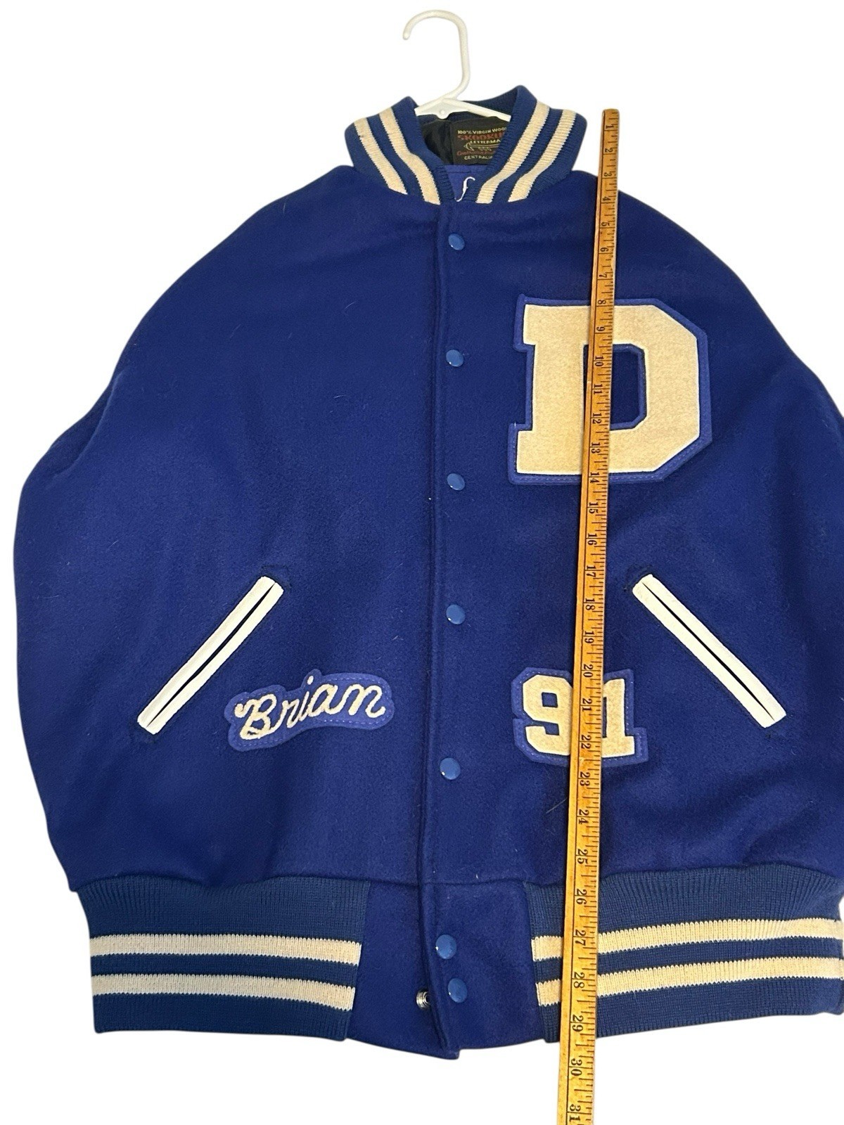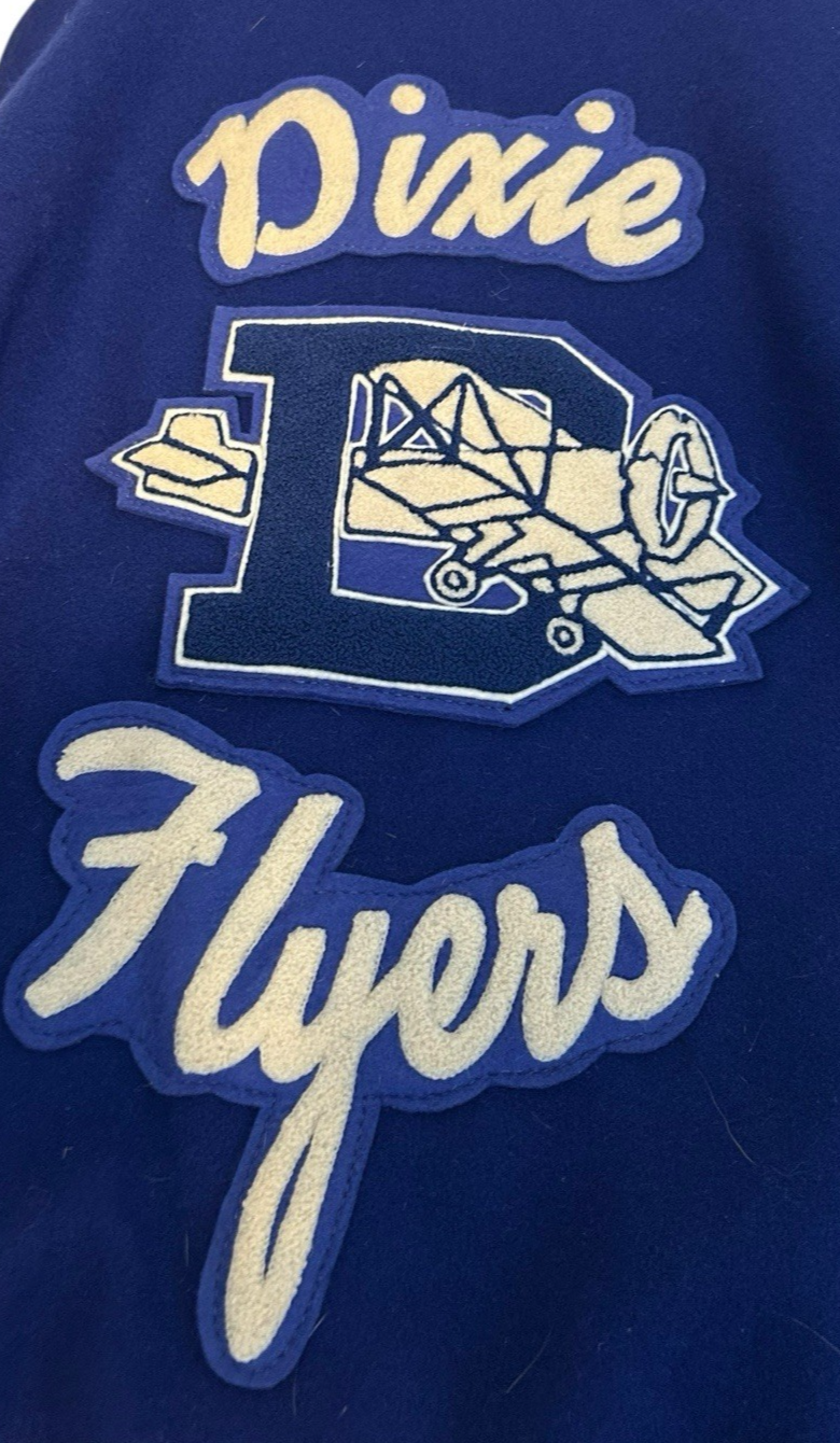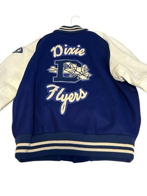 Skookum Virgin Wool Leather Sleeves Jacket Blue White Dixie Flyers "Brian" Size 50. See all Measurements for proper fit.