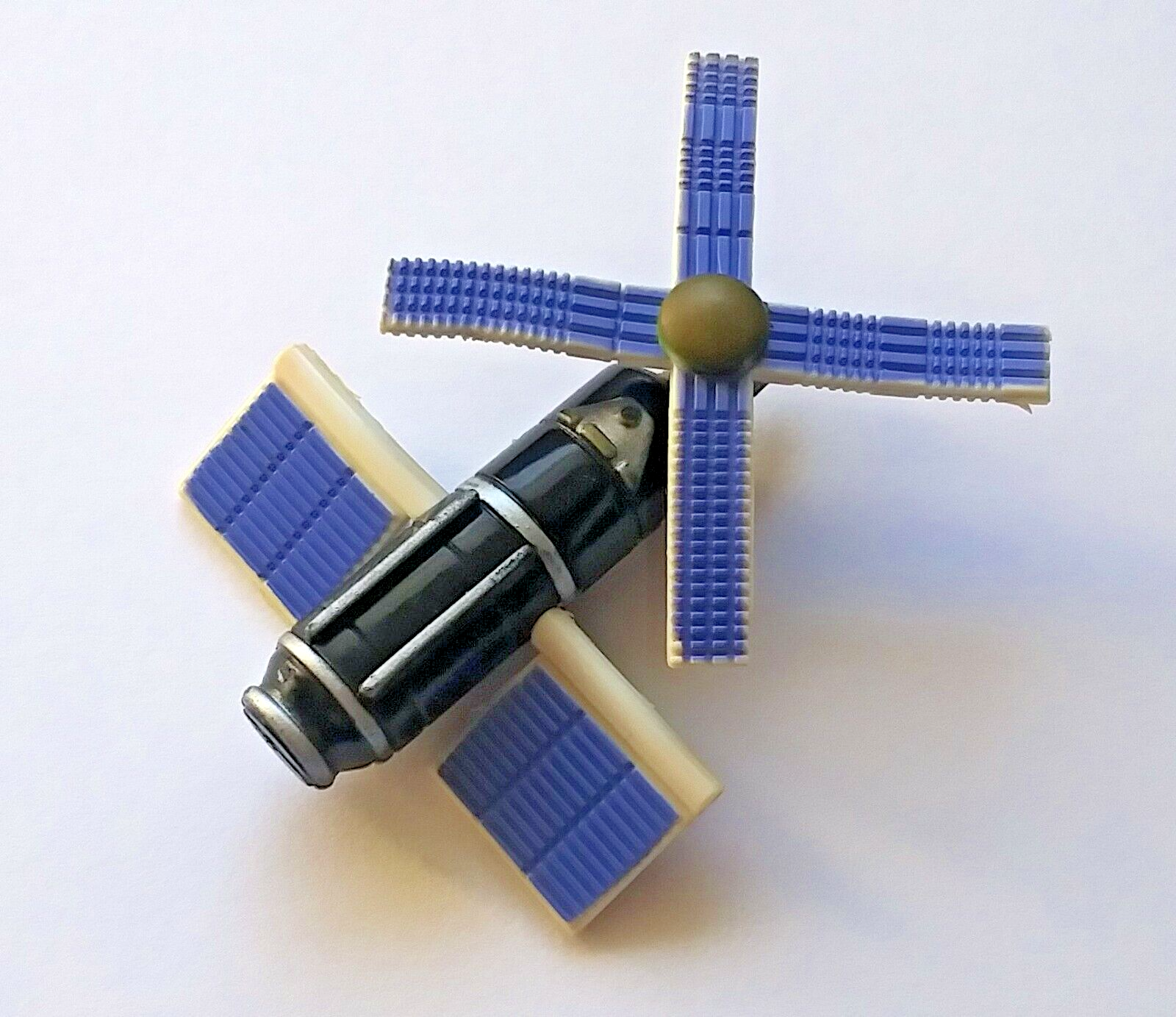 This is a lightly used condition, small scale model of the one and only Skylab Space Station. Part of the NASA Space Explorers series, this is not easy to find. It's made of hard plastic, and all of the solar panels rotate completely. It's 2 and 3/4 inches long including the windmill type panels, and looks just like the real thing (with one exception, in that one of the solar panels along the body of the actual Skylab station never deployed as was planned, causing the spacecraft to super-heat, until a fix was done).