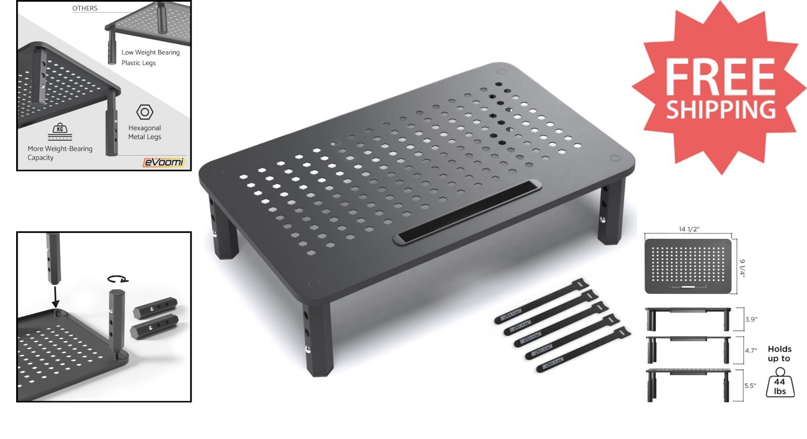 Enhance your workspace with the upgraded VentTech Monitor Stand, engineered for faster performance and supreme durability. Featuring hexagonal ventilation ports that prevent slow processing and an onboard slot for your phone or tablet, this stand helps you see and do more with less effort. Constructed with heavy-duty HD steel legs and a single-piece molded hexagon shape, it offers unmatched strength, stability, and resilience against wobbling or tipping. Its anti-skid design ensures safety on any surface, indoors or outdoors, preventing slips or falls. Easily adjustable to three different heights, it can be assembled in seconds to perfectly align with your ergonomic needs, reducing neck, back, and eye strain. Invest in productivity and comfort?your workspace deserves the best. To ensure fast and reliable delivery, we work with multiple fulfillment partners and suppliers. Depending on availability and location, your order may ship from different warehouses or arrive in packaging that varies from item to item. Tracking details are typically provided shortly after shipment, and customer satisfaction remains our top priority. Please note that due to carrier policies and regional regulations, certain items may not be eligible for delivery to specific states or territories.