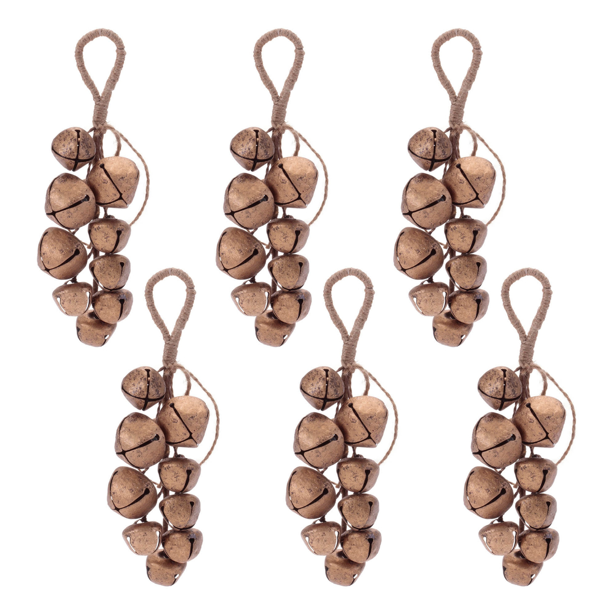 Add a touch of rustic holiday charm with this Sleigh Bell Cluster Drop set! Featuring dark brown and copper tones with a chic metallic finish, these classic sleigh bells bring a nostalgic and festive feel to your holiday decor. The jute-wrapped hanger adds a farmhouse-inspired accent, making them perfect for hanging on your Christmas tree, incorporating into wreaths and garlands, or using as table decor for holiday events. Sold in a set of six pieces.