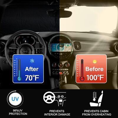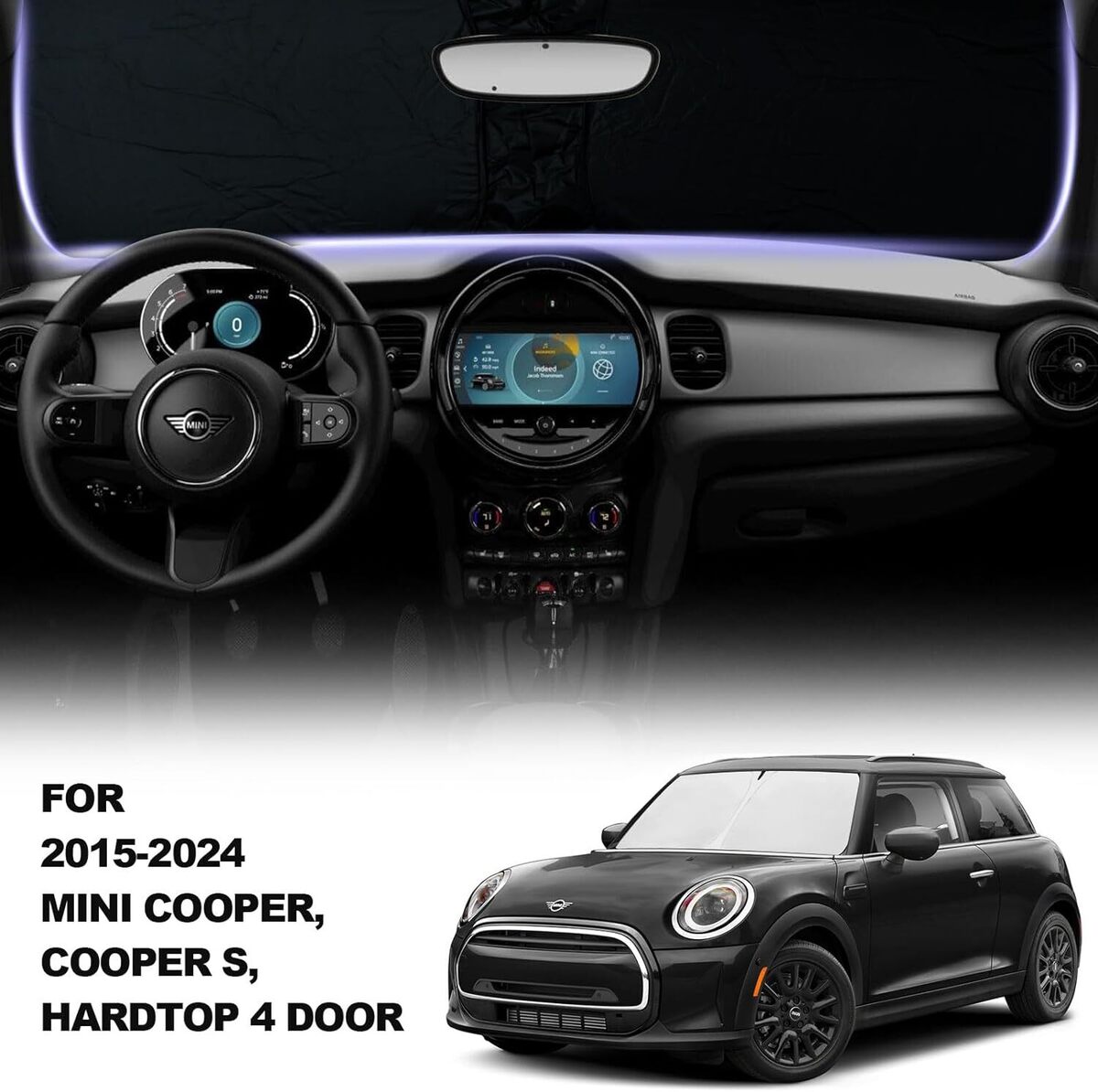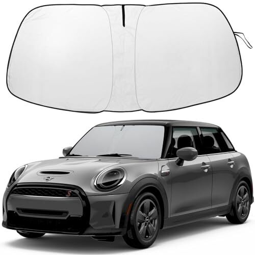 Perfect Fit: Front windshield shade has been custom cut specifically for 2015-2024 Mini Cooper, Cooper S, Hardtop 4 Door (F55, F56, and F57)?Precise fit design and Reinforced steel rings make enough to make the shade fit precisely to the window Double Layer Material: Mini Cooper sunshade made of 240T reflective fabric, higher density, double layer design, including black heat insulation layer and silver reflective layer, providing better protection from the sun Easy To Install And Store: Mini Cooper S sun shade Made of elastic memory wire, never deformed, easy to unfold and store comes with a convenient storage bag Great Protection:Windscreen visor not only protects the interior of your car from harmful UV rays and heat, but also prevents the dashboard and seats from fading. Keep Your Car Cool: Foldable Sunshade blocks harmful UV rays and reduces heat build-up, keeping your car cool and comfortable on hot summer days