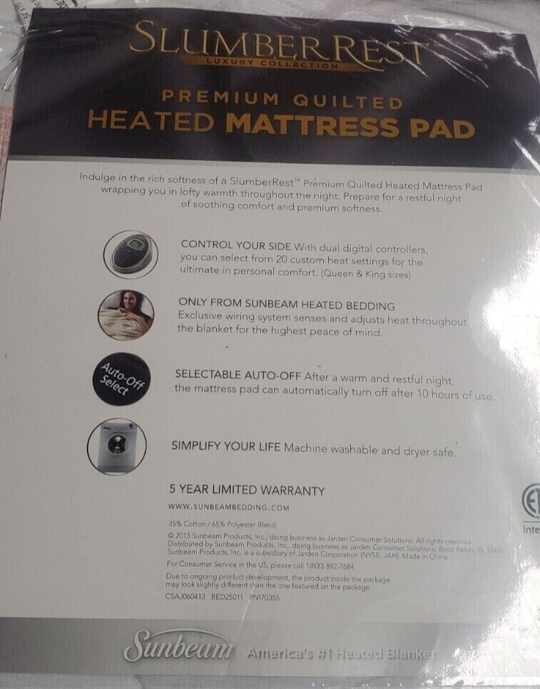 Sleep well. The Premium Heated mattress pad from Slumber Rest provides lofty warmth and soothing comfort throughout the night. Features a 7" diamond design and twenty heat settings so you can find your perfect temperature. Dimensions: 54" x 75" 20 heat settings 10-hour auto shut off Comes with one controller Ideal for winter bedding 5-year warranty Cotton/polyester; polyester fill Machine washable Imported