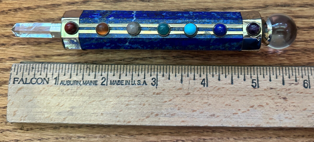 - Small 7 Chakra Lapis Wand with Clear Quartz Point!