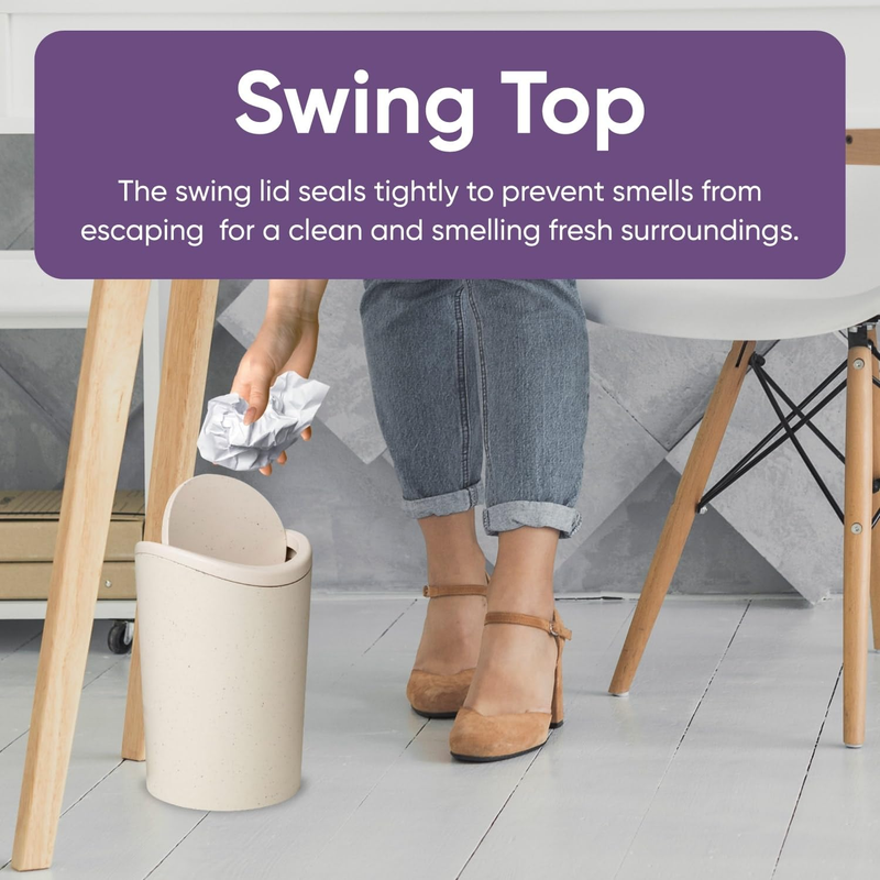Swing top trash can ? Keep your garbage hidden away with this plastic bin designed to reduce the spread of germs and odors. The swing lid seals tightly to prevent smells from escaping so you can keep your surroundings clean and smelling fresh. Perfect to use as kitchen trash can or bathroom trash can.