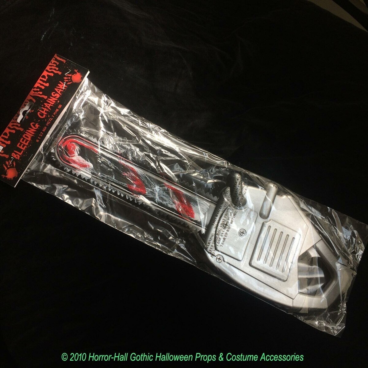 Toy horror movie theme prop weapon measures approx. 18-inch Long x 6-inch Wide. Features soft molded plastic silver gray body and blackened bar saw-chain smeared with white color paint splashes and faux red blood spatter. Decorate your slaughterhouse, chop shop or meat market, use to Create HAUNTED HOUSE WARNING SIGNS, creepy horror photo booth prop, or accentuate your serial killer costume with this murder themed chainsaw accessory. Cheap, small lightweight prop building accessory.