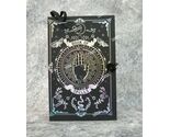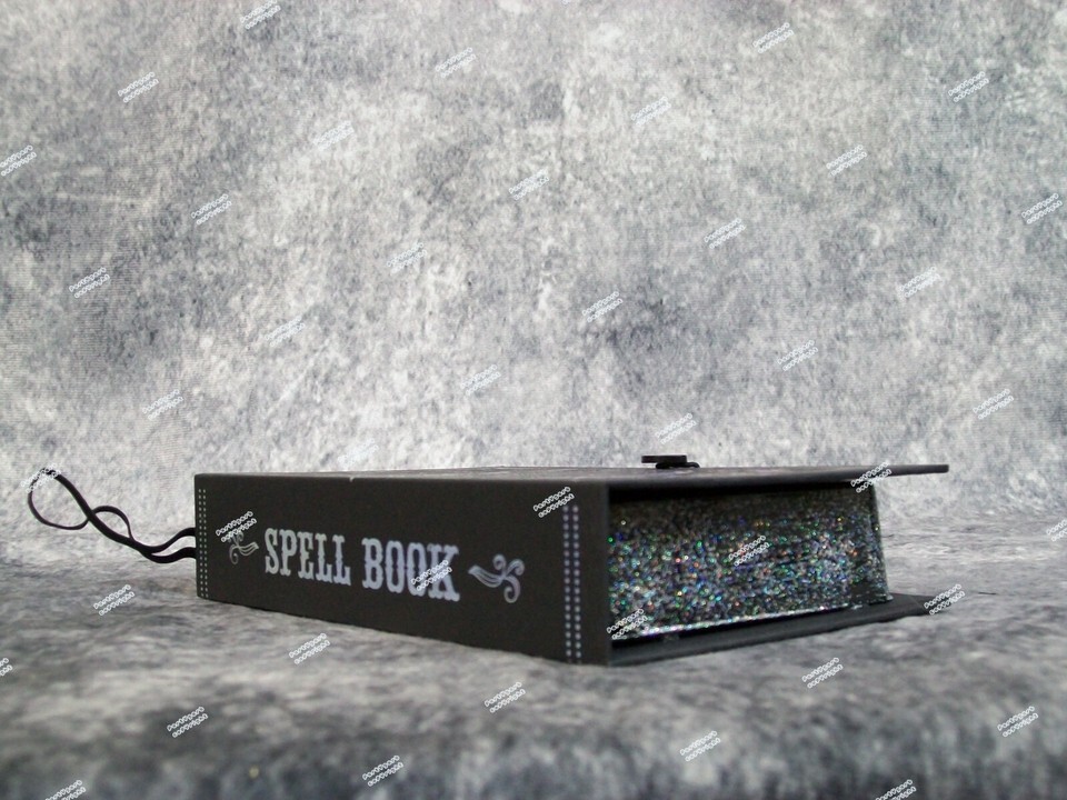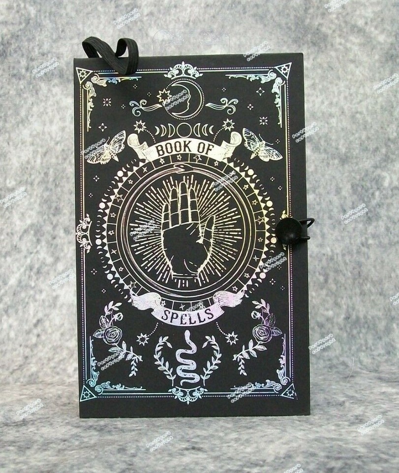 Fake Witch Spell Book. Has an elastic String loop on the spine side. Made of paperboard and plastic. Has a plastic insert on the inside that could hold some small lightweight items. The plastic has glitter on it around the sides, Glitter will shed some. Some have the plastic slightly warped outward toward the edge and some are more straight. Not sure of it's supposed to warped looking to appear like pages or straight. Closure is an elastic loop over a round button. You could use this as part of your costume or use in a haunted house etc. Be creative. Paperboard may have some indentures. Paperboard Measurements: Approx Size: 7.75" Tall (top to bottom), 5" deep (from spine to edge of cover) and 1.5" thick. Inner plastic chamber is slightly smaller. Approx. 6.25" x 3.5". Measurements taken at the longest points. For decoration or novelty use as a prop for your Halloween Party or costume. For adult use. For ages 14 and up.