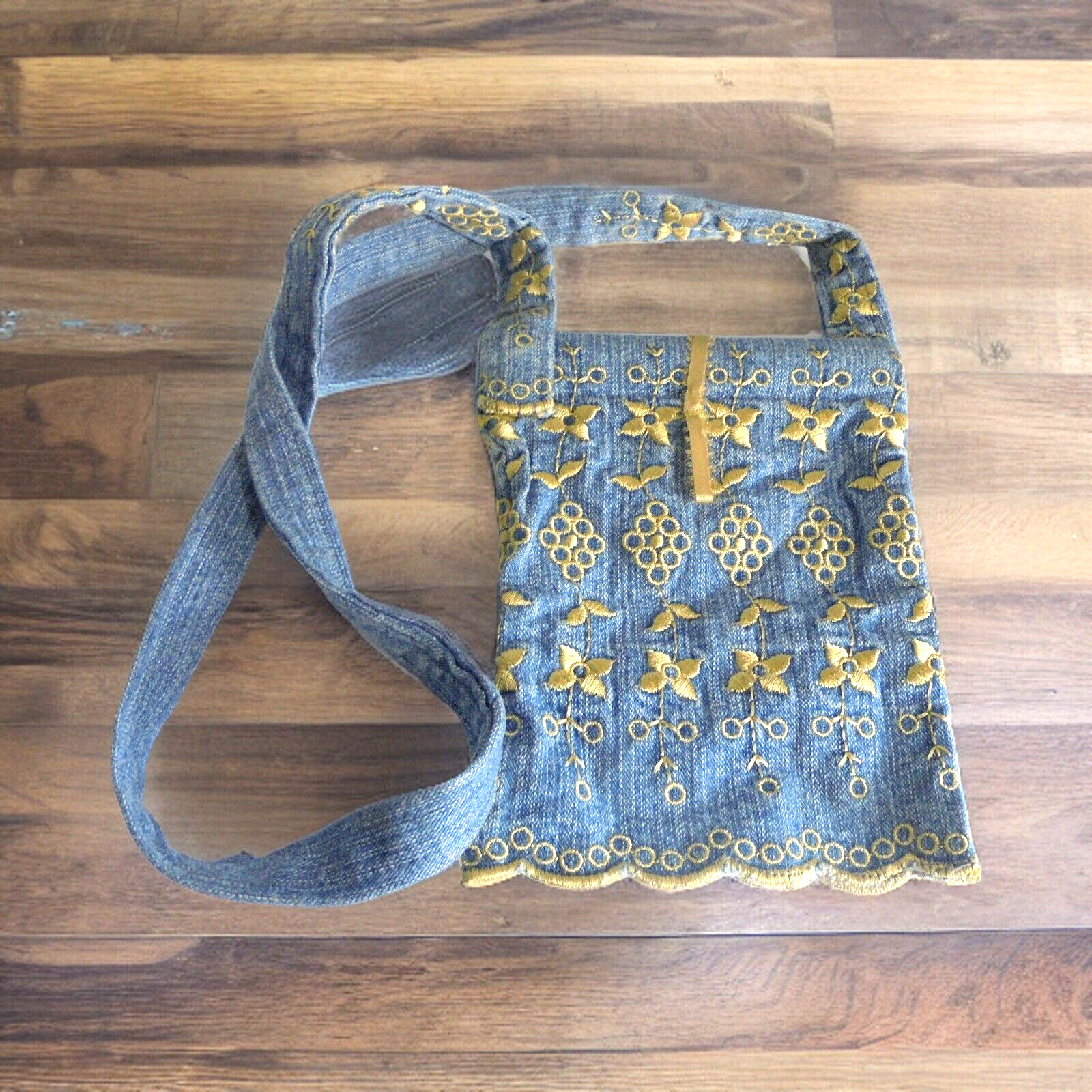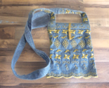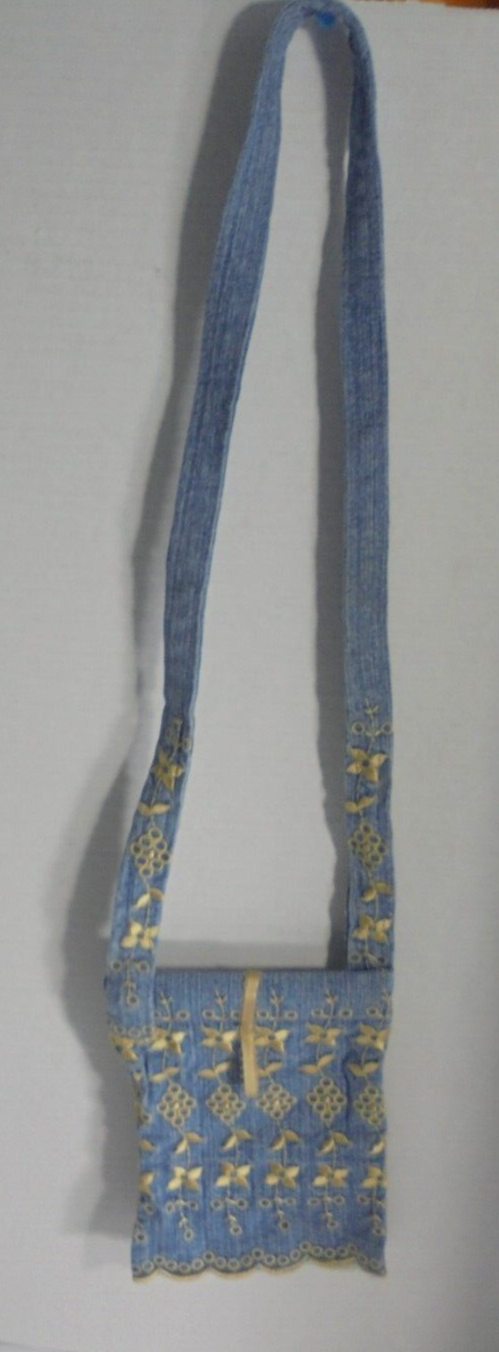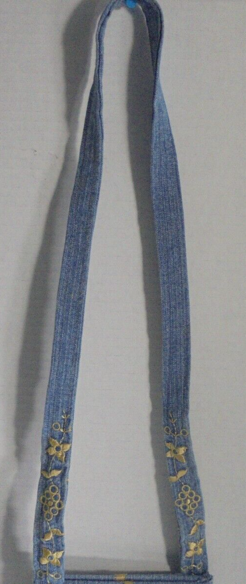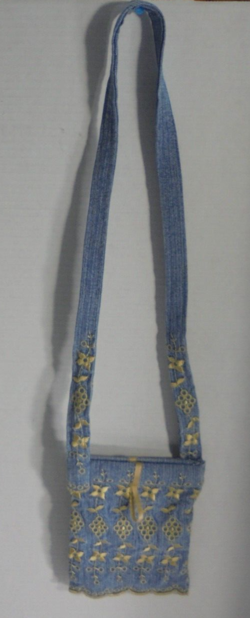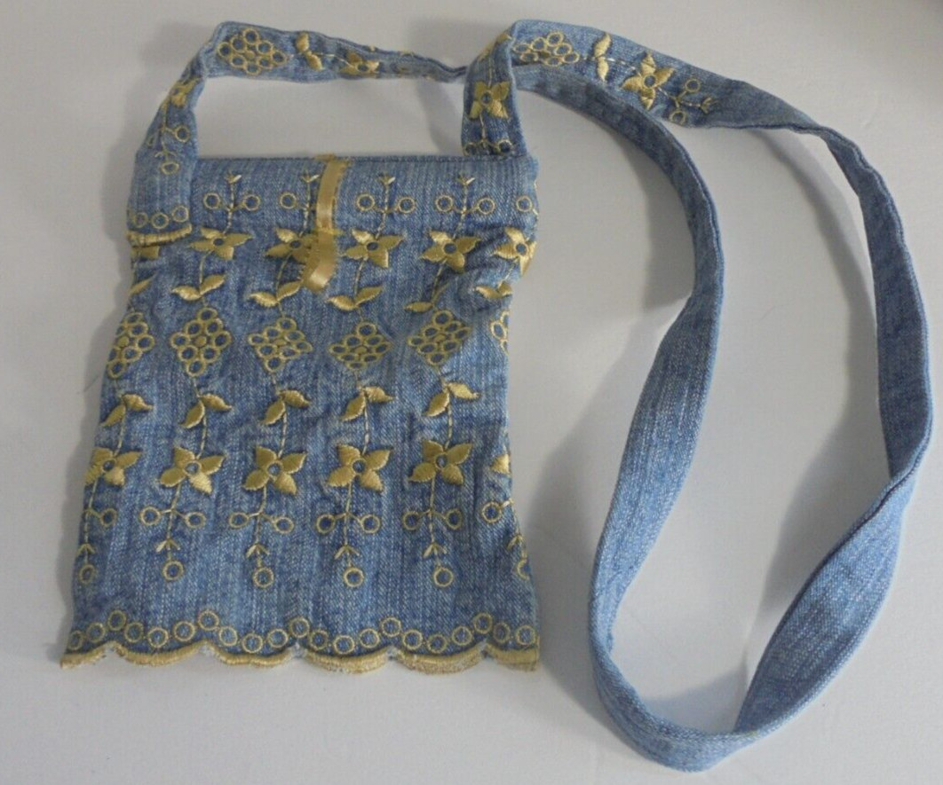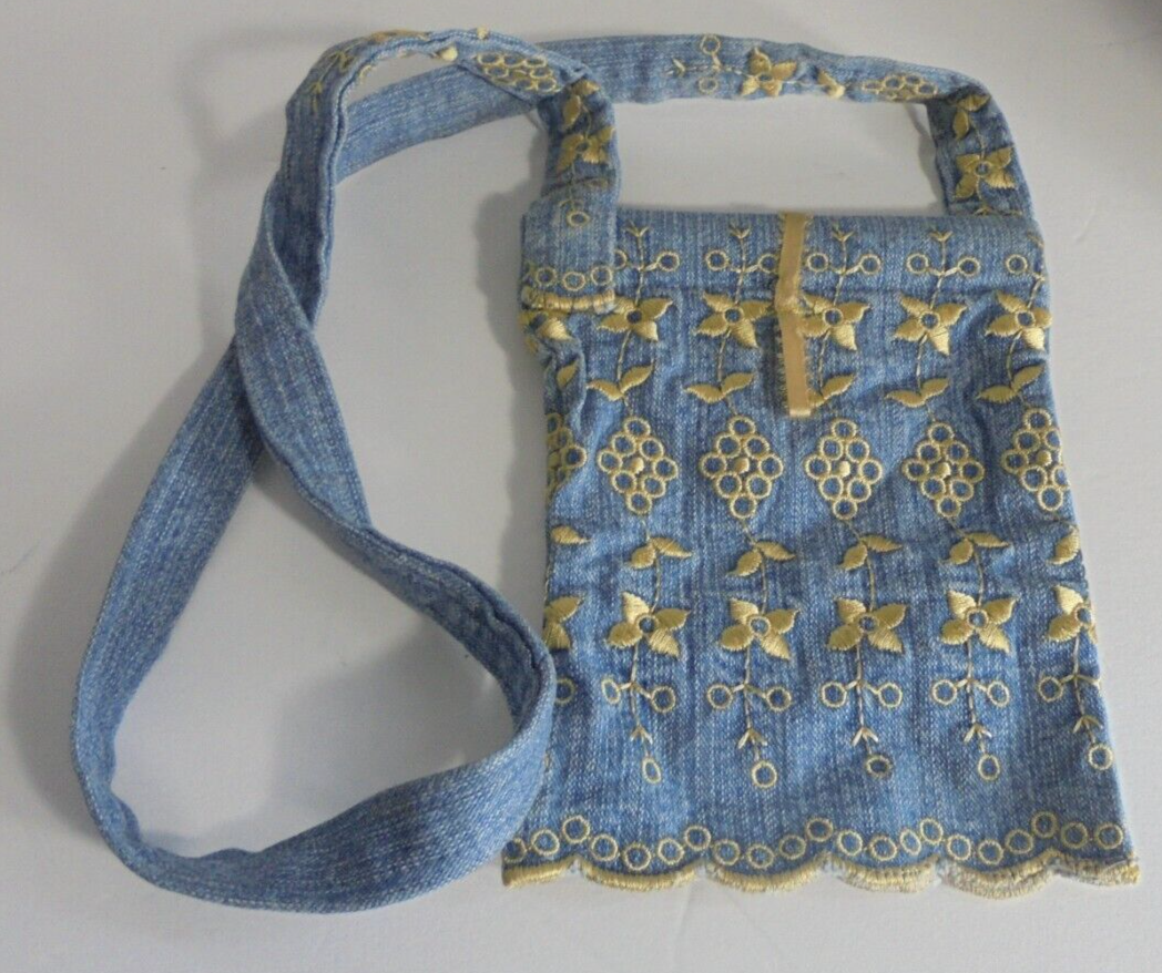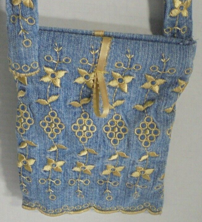 - Small Mini Embroidered Denim Jean Purse Bag with Long Strap Blue Gold