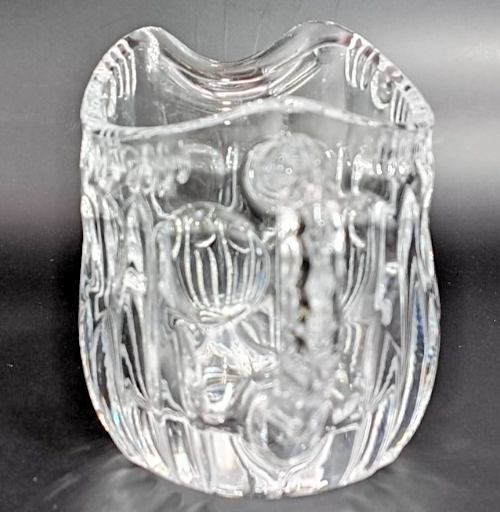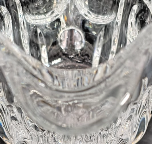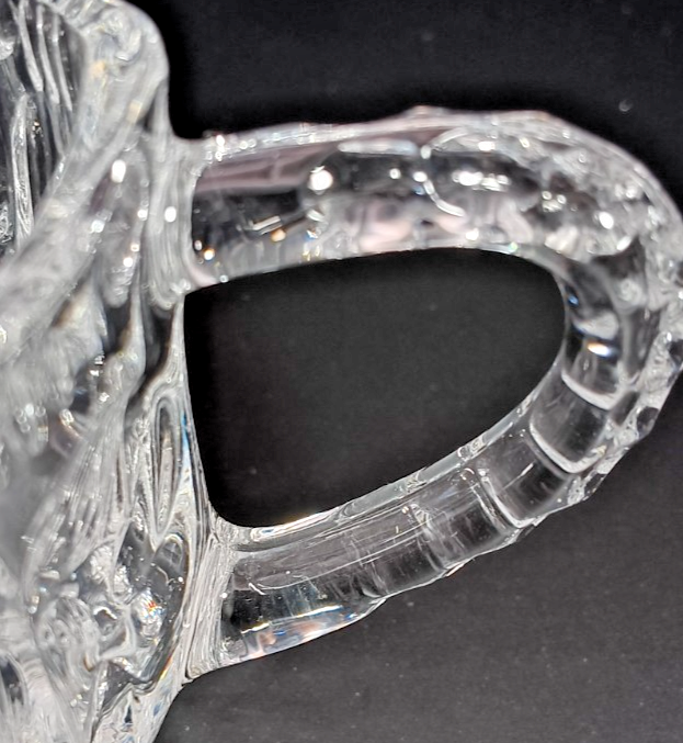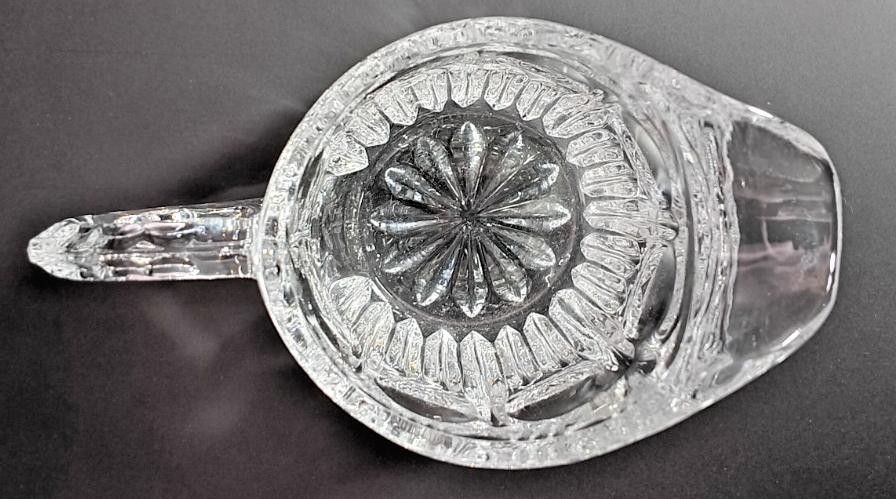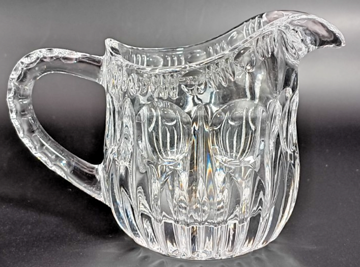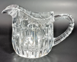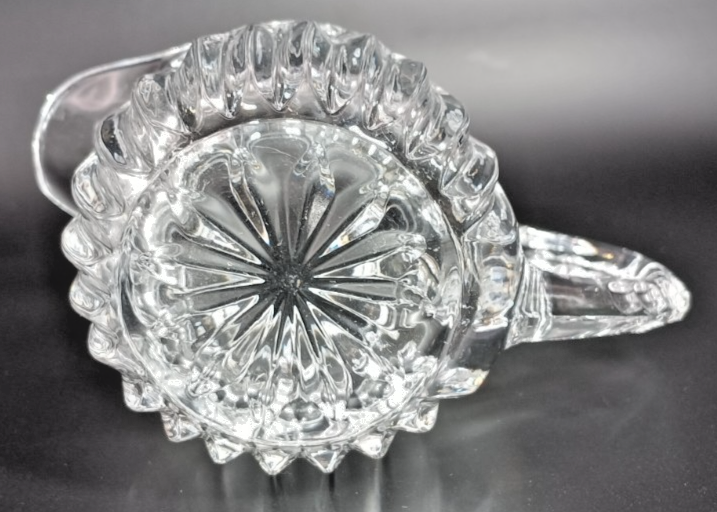This small vintage crystal thumbprint creamer features a clear color and intricate thumbprint pattern. Crafted from crystal, this original piece has dimensions of 4.25" in length, 3" in height, and 2.25" in width. The brand is unmarked, and it weighs 7.6oz. This decorative creamer adds a touch of vintage charm to any dining table, perfect for serving cream or milk with a unique and elegant style.