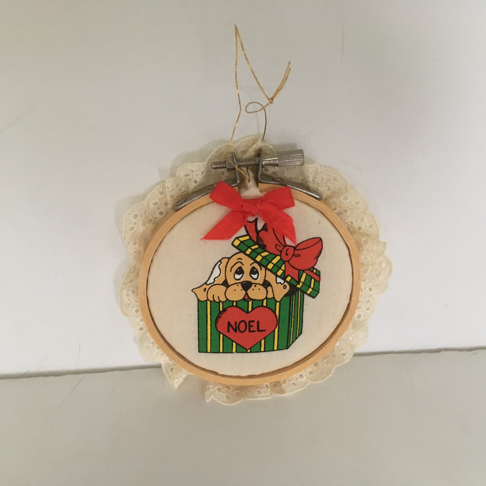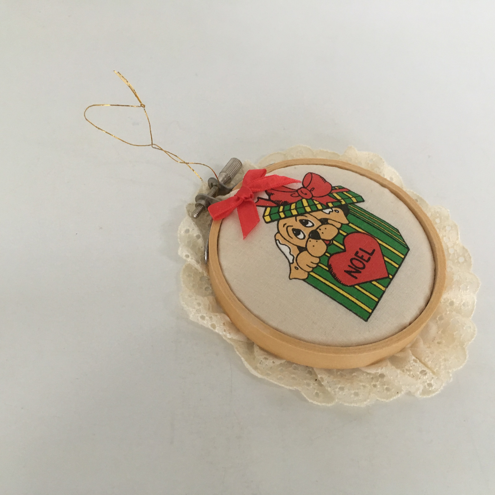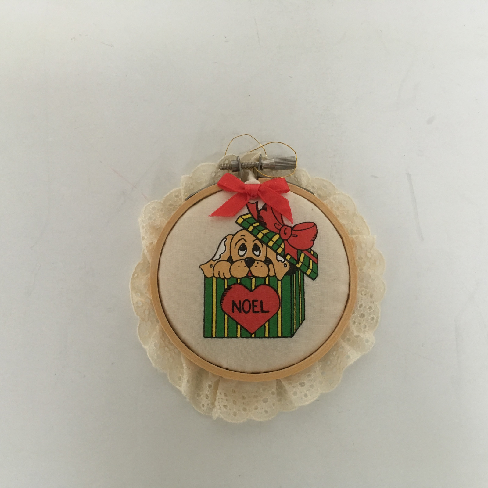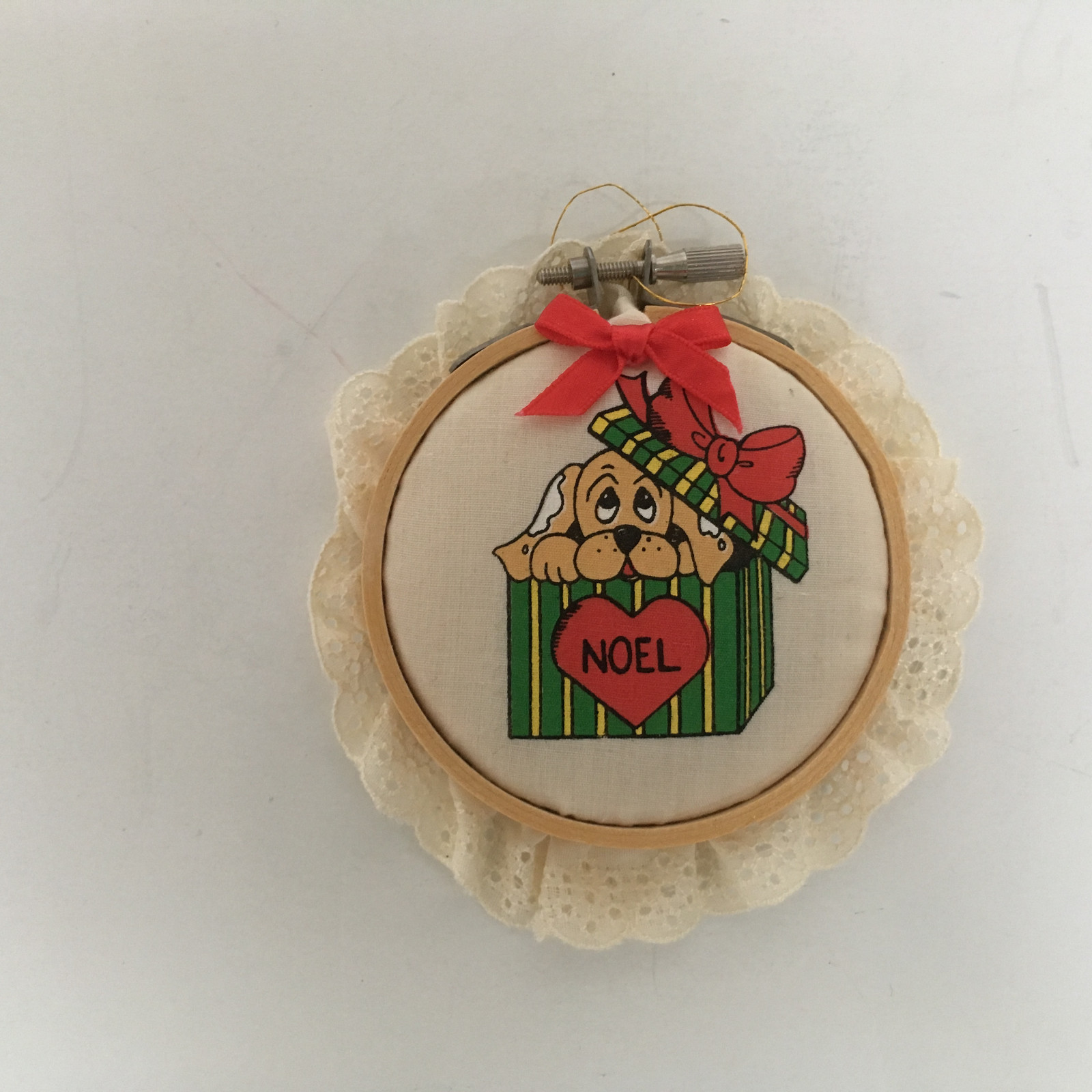 - Small vintage embroidery hoop fabric Christmas ornament puppy in noel gift box