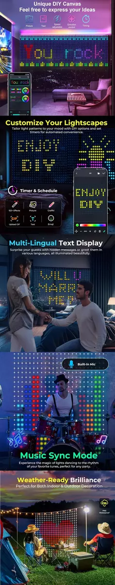 Transform any space with these 1/2PCS Smart LED Curtain Lights, featuring app control, music sync, DIY patterns, and waterproof design for stunning indoor or outdoor decoration. Use the mobile app to adjust colors, create animations, set timers, and sync the lights to music for parties, holidays, or relaxed ambiance. Perfect for bedrooms, windows, living rooms, patios, weddings, Christmas, and festive events. Easy to install, energy-efficient, and ideal for creating a magical atmosphere anytime.