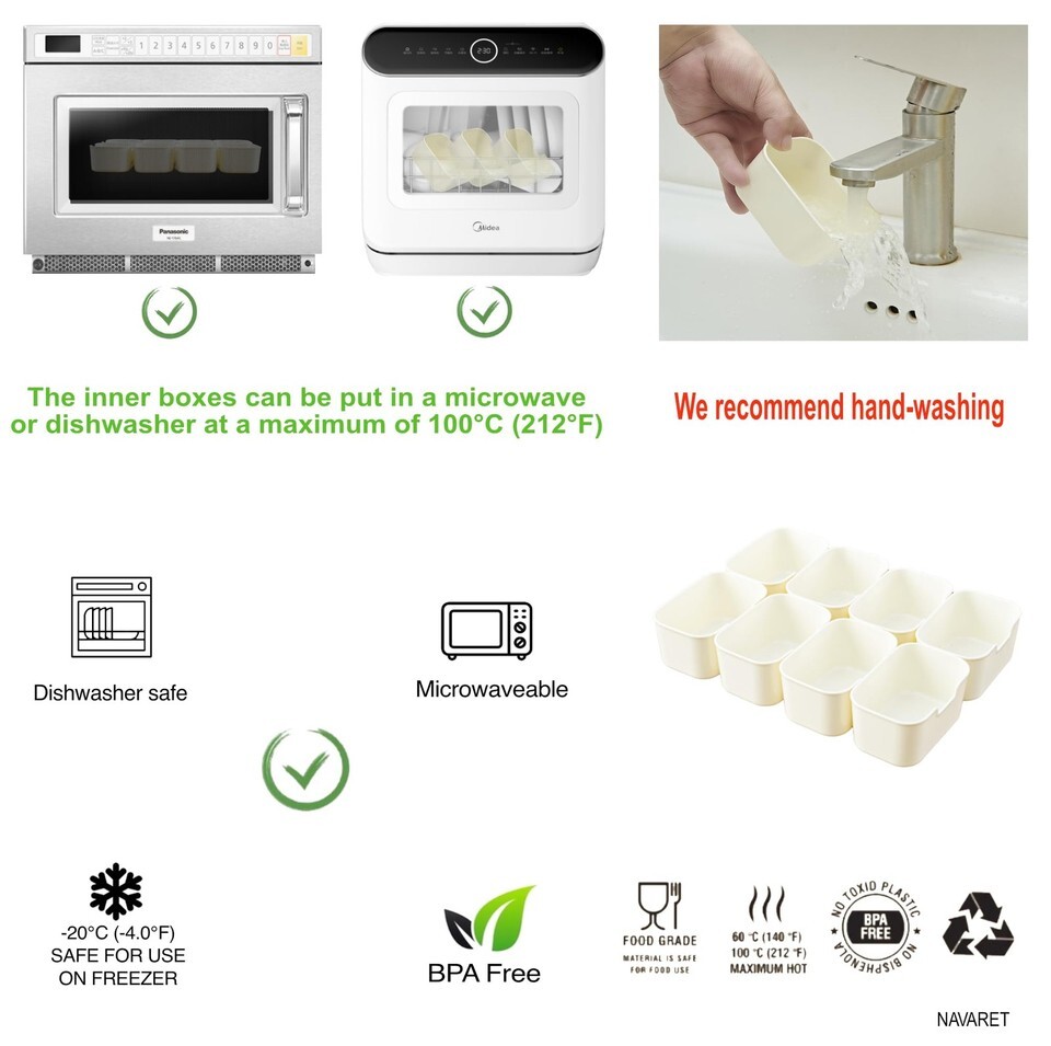 Friendly reminders : Transparent Box and Lid are made in PET therefore CANNOT BE MICROWAVED or DISHWASHED. Tolerated temperature is -20 C to 60 C. The 8 or 4 inner compartments are made in PP, so they can be put in the MICROWAVED for 3 minutes or in the top rack of the DISHWASHED. Tolerated temperature is 100C.